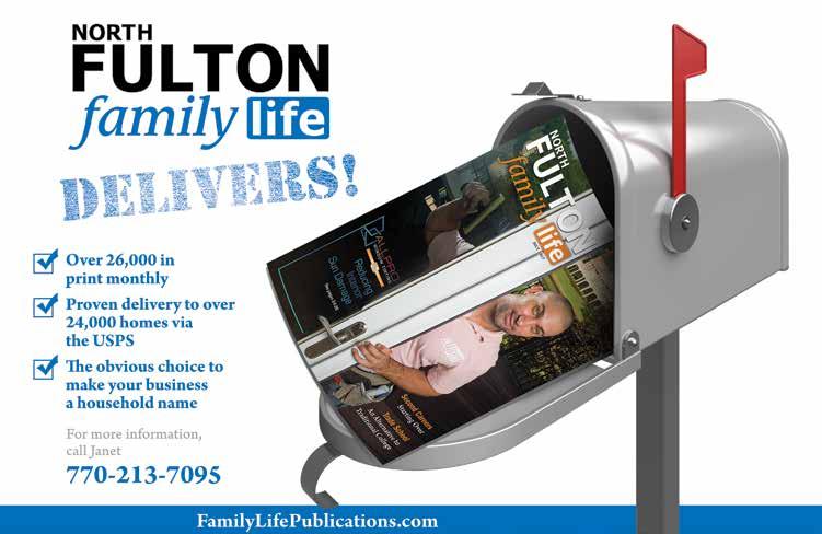 The viewpoints of the advertisers, columnists and submissions are not necessarily those of the editor/publisher, and the publisher makes no claims as to the validity of any charitable organizations mentioned. North Fulton Family Life magazine is not responsible for errors or omissions. No part of this publication may be reproduced or transmitted in any form or by any means without written permission from the publisher.