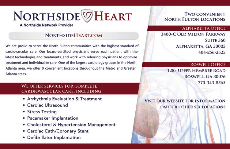 The viewpoints of the advertisers, columnists, and submissions are not necessarily those of the editor/publisher, and the publisher makes no claims as to the validity of any charitable organizations mentioned. The cover and its accompanying magazine content are a paid advertisement. North Fulton Family Life magazine is not responsible for errors or omissions. No part of this publication may be reproduced or transmitted in any form or by any means without written permission from the publisher.