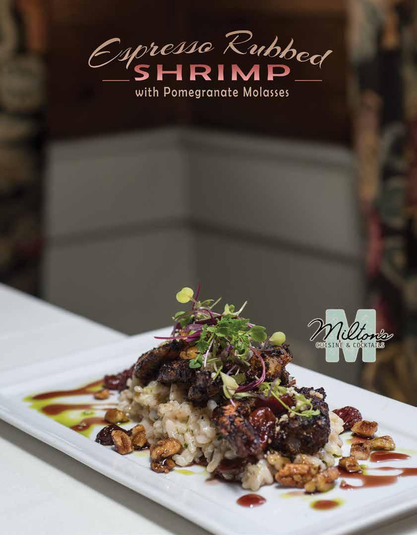 Season the shrimp liberally with espresso seasoning, and place in a hot, cast-iron skillet until a crust forms (about 1 minute). Flip the shrimp, repeat, and reserve for later. Next, in a small pot, stir together the cooked rice and chicken stock on medium heat until the liquid is absorbed. Add the cream and stir until liquid has been absorbed. Then, while the heat is off, stir in the blue cheese, pecans and cherries- in that order. Place on a plate.