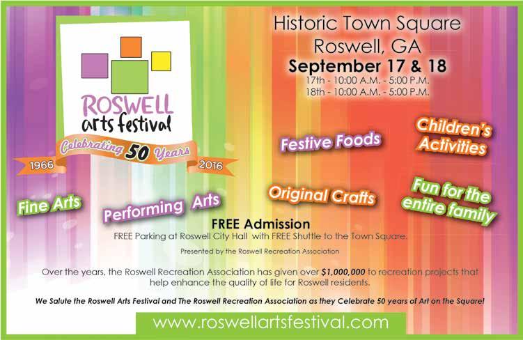 Arts Festival Enjoy artists and local entertainment, children’s activities, food trucks and a healthy dose of small-town charm. See page 38 for more information. 10:00 am5:00 pm, Historic Town Square, Roswell. RoswellArtsFestival.com