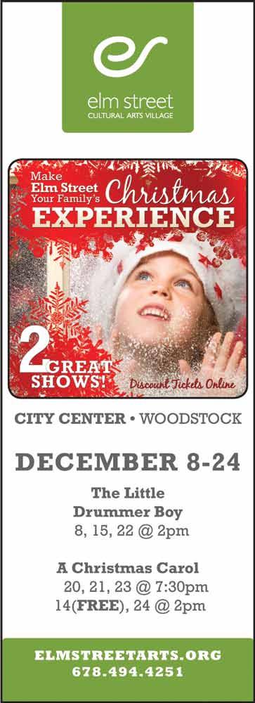 ‘The Little drummer Boy’ Elm Street Cultural Arts Village performers will tell the classic story of a little boy, Daniel, who receives a handmade drum for his birthday just before traveling to Bethlehem with his parents to pay their taxes. They meet Mary and Joseph, the Three Wise Men and the Innkeeper along the way. Tickets can be purchased in advance or at the door. 2 p.m., City Center Auditorium, 8534 Main St., Woodstock. 678-494-4251, ElmStreetArts.org