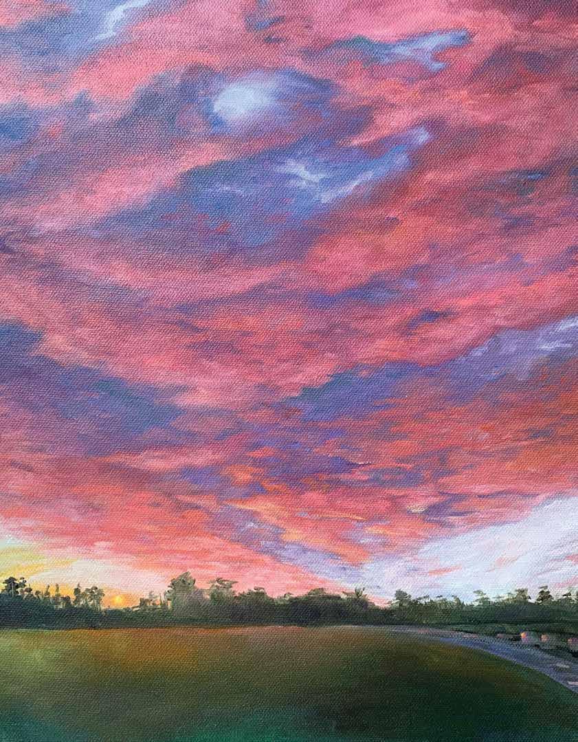 For example, she has been inspired by water towers and barbershops, and once, while on a drive, she spied an old Coca-Cola machine, so she stopped and took photos of it. She later painted a close-up of the machine that depicts only a small bit of the faded red metal and the much-used buttons, yet it immediately evokes memories of hot summer days and cool, refreshing sodas.