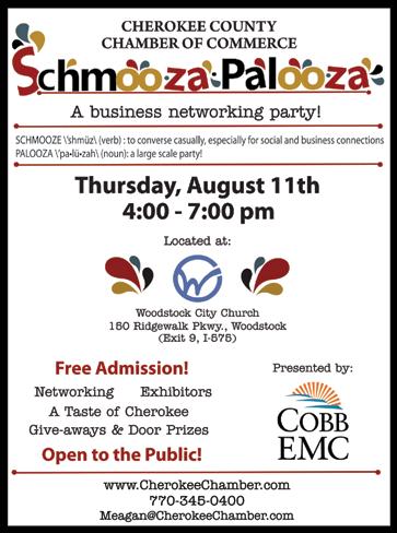 Schmooza Palooza — Learn more about Cherokee County businesses and enjoy door prizes, food, and fun. Guests will have the opportunity to solve an interactive puzzle and enter for a chance to win a prize. Admission is FREE. 4:00-7:00pm, Woodstock City Church, 150 Ridgewalk Parkway, Woodstock. 770-345-0400. CherokeeChamber.com
