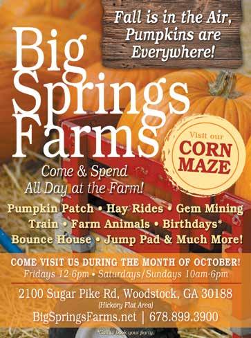 23 The Great Pumpkin Fest — Bring the whole family to enjoy this FREE fall festival! There will be bounce houses, craft vendors, a DJ, food trucks, lawn games, face painting, a hayride, and more. Bring your own pumpkin to launch from the trebuchet, and don’t forget to wear your costume and trick or treat at each of the vendors. 10:00am-4:00pm, Cherokee Veterans Park, 7345 Cumming Highway, Canton. BBJohnson@cherokeega.com