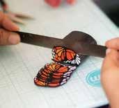 involves rolling a cane of one color and then adding pieces of other colors. Smaller canes in different colors can encircle the primary cane. The result is like a roll of sushi that contains several ingredients — when sliced, it reveals multicolored designs. She then models the slices into shapes, sometimes geometric, sometimes petals that seem to move with the grace of dancers.