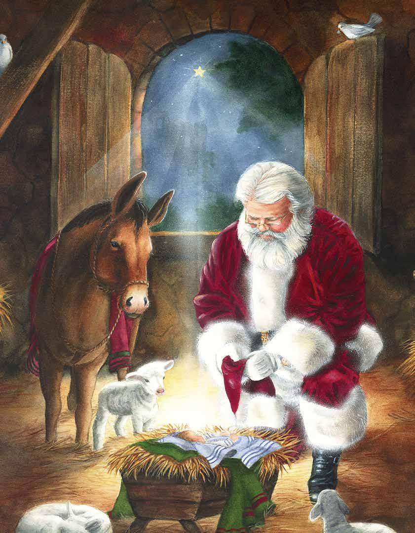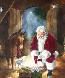 It is Santa’s face, its luminosity and expression, that captures the viewer’s eye. The direction of Santa’s gaze often leads the viewer to the painting’s message: the reverence of Mary cradling Jesus; Santa’s awe of the infant Jesus; the dove of peace; the enduring strength of the flag; or the love between Santa and Mrs. Claus.