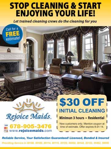 Canton Paw Park (135 Juniper St., Canton) and Woofstock Park (150 Dupree Road, Woodstock) offer man’s best friend a place to enjoy the fresh air, stretch their paws, and exert some energy. Canton Paw Park, built and maintained by volunteers without city or county funding, has separate areas for large and small dogs. The park also offers waste bags, water and benches. Woofstock Park features separate off-leash areas for large and small breeds, as well as new play platforms. A new trail head is expected to be completed in the fall that will connect Woofstock Park to the downtown and Towne Lake areas.