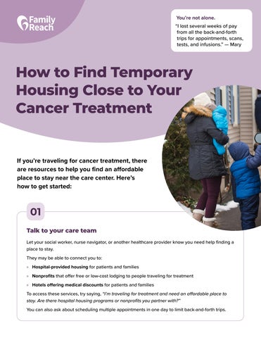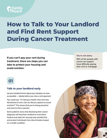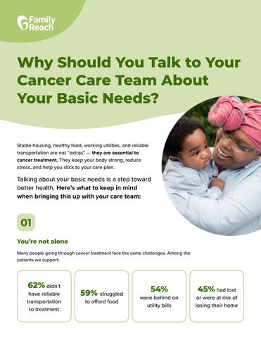 Family Reach is the only national nonprofit focused solely on helping people with cancer access food, housing, utilities, and transportation. Treatment requires more than medicine — families need a roof over their heads and food on their tables to survive. We work with patients, care teams, and community-based organizations to provide immediate and ongoing financial support for these basic needs. Together, we’re challenging the systems that force people to choose between their health and their homes.