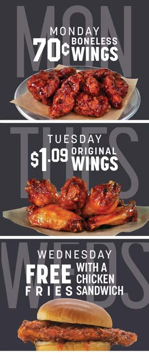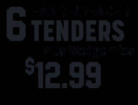 FREE BURGER, SANDWICH OR SALAD WITH PURCHASE OF ANY BURGER, SALAD OR SANDWICH & 2 MEDIUM SOFT DRINKS Offer valid until 09/30/23 at Shelbyville, KY location only. Valid on dine in, online or carry out orders. Not valid for 3rd Party Delivery. Excludes alcohol. Free burger, sandwich or salad is of equal or lesser value. Not valid with other discounts or offers. Void if reproduced, altered or expired. No cash value. CODE: SHB1G1 $300 OFF ANY ONLINE ORDER OVER $20 Offer valid until 09/30/23 at Shelbyville, KY location only. Valid on online orders only. Not valid for 3rd Party Delivery. Excludes alcohol. $35 must be reached before tax. Not valid with other discounts or offers. Void if reproduced, altered or expired. No cash value. CODE: SHOLO $20 OFF ANY CATERING ORDER OVER $100 Offer valid until 09/30/23 at Shelbyville, KY location only. Valid on catering orders only. Not valid for 3rd Party Delivery. Excludes alcohol. $100 must be reached before tax and gratuity. Not valid with other discounts or offers. Void if reproduced, altered or expired. No cash value. CODE: SHCAT TUESDAY: 79¢ BONELESS WINGS THURSDAY: 89¢ TRADITIONAL WINGS WEDNESDAY: $ 1.29 CHICKEN TENDERS Valid only on 3 or 5-count baskets. 1263 Mt. Eden Rd. • Shelbyville, KY 40065 • 502.437.2160 • buffalowingsandrings.com NO LIMIT! NO LIMIT! MONDAY: KIDS EAT FREE Limit 1 Free Kid's Meal per adult meal purchased. We Do Celebrations & Gatherings Better! Order catering for your next event. EVERY OTHER THURSDAY: TRIVIA NIGHT EVERY MONDAY: LIVE MUSIC 5:30–7:30PM * * DAILY SPECIALS! * * JOIN US FOR CORN HOLE ON WEDNESDAY NIGHTS! EVERY TUESDAY: KARAOKE 6:30–9PM