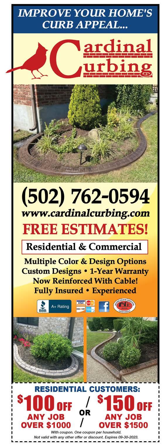 Hardscape Edging Services • Flower Bed Borders Decorative Curbing • Landscape Edging FREE ESTIMATES! 502-641-1111 www.CurbanLegends.com Visit our website to Discover our Unique Designs, Patterns & Colors, View our Project Gallery or to Request a FREE Estimate! UNIQUE ONE-PIECE PROCESS EFFECTIVE LONG-TERM DURABILITY Follow Us On MOST JOBS COMPLETED IN ONE DAY! $100 off per foot Any Service Over 100 Feet FREE ESTIMATES! 502-641-1111 With coupon at time of estimate. Limit one coupon per household. Not valid with any other discount. Expires 09-30-2023. MR. FIX IT Handyman Service LLC "Let Us Fix Your Problems Right The First Time" 502-504-5052 or 502-504-5054 email: Mr.FixItHandymanServiceKY@gmail.com OVER 30 YRS. EXPERIENCE! • Carpentry • Decks • Pressure Washing • Bonus Rooms • Drywall • Screened Porches • Garages • Basements • Custom Trim • Patios • Carports • Additions • Painting • Privacy & Picket • Storage (Interior & Exterior) Fencing Buildings AND MUCH, MUCH, MORE! If You Want It, We Can Do It CUSTOMER SATISFACTION ALWAYS COMES FIRST WITH US! $25 OFF Any job quoted over $250.00 Provide coupon at time of quote. Coupon void after 30 days of quote. $50 OFF Any job quoted over $500.00 Provide coupon at time of quote. Coupon void after 30 days of quote. FREE ESTIMATES! Your One Stop Shop For All Your Home Improvement & Remodeling Needs! Services NOT Available In Southern Indiana At This Time. LOCALLY OWNED & OPERATED FREE ESTIMATES 502-963-2314 • Basement Waterproofing • Concrete Services –Porches, Sidewalks, Driveways & More • Water Damage Preserve the Structure and Stability of Your Home. HHHHH "Phillips Waterproofing was excellent. They were completely professional, prompt, courteous, and performed excellent work. The cost of the project was more than reasonable. I would not hesitate to use them again, and would definitely recommend them to others." –Angela P. of Cub Run, KY WE FIX WET BASEMENTS & CRAWL SPACES WE REPAIR WALLS, FOUNDATIONS & OTHER STRUCTURAL DAMAGE WE SOLVE DAMPNESS & MOLD PROBLEMS GET RID OF VIRUS, MOLD, & MILDEW! $200 OFF Any Project Over $2,000 Must present coupon at time of estimate. Not valid with any other offer, discount or previously quoted or completed projects. Expires 09-30-2023. $300 OFF Any Project Over $5,000 Must present coupon at time of estimate. Not valid with any other offer, discount or previously quoted or completed projects. Expires 09-30-2023. LIFETIME TRANSFERABLE WARRANTY • FINANCING AVAILABLE