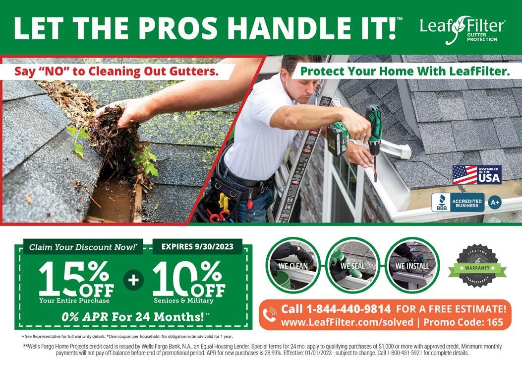 LOUISVILLE’S #1 HOME BUYER! WE BUY HOUSES FAST & FAIR! Get Information 24/7 502-233-7464 www.LSThomebuyers.com If you are ready to sell NOW, contact us TODAY! If You Want Us To Swing By And Make You An Offer On The Spot, CALL US NOW! 4 We buy houses fast and easy, often in as little as 7 days! 4 We can relieve your stress and help you regain your peace of mind. 4 Qualified homeowners can get a purchase and sale agreement on the spot, at the first meeting. 4 We are investors looking to buy your house. We are NOT looking for listings. 4 We can often purchase your home even if you owe more than it is worth. “I want to thank you for a wonderful experience with your company. Your honesty and experience were greatly appreciated. I felt very comfortable with the entire process and would gladly refer business to your company. Please let me know if I can be of any assistance to you in the future. Thank you again for your professionalism.” – Robin of Louisville, KY FREE 50" 4K TV when we purchase your home! With this FAMILY SAVINGS coupon only. Cannot be combined with other offers. Expires 09-30-23. 9152 Taylorsville Rd., Louisville LouisvilleGutterCover.com • GUTTER CLEANING • Eliminates Hazardous Cleaning • Prevents Ice, Snow And Leaf Build-Up • Made Of Heavy Aluminum • LIFETIME NO-CLOG Warranty • Unique Micro-Pore Filtration • GUTTER REPAIR/REPLACEMENT • Installs Over New Or Old Gutters • Adds Value To Any Home Or Business YOUR PERMANENT SOLUTION TO GUTTER DEBRIS! CALL FOR A FREE ESTIMATE! 502-458-2345 OR 502-817-6417 A division of The Roof Doctor QUOTES ARE FREE, QUICK, & COMPETITIVE! (CALL OR TEXT) WE WILL NOT BE UNDERSOLD! INSTALLS ON YOUR EXISTING OR NEW GUTTERS! NEVER DO THIS AGAIN! Valid with coupon only. Not valid with any other offers. Expires Sept. 30, 2023. FSM. Valid with coupon only. Not valid with any other offers. Expires Sept. 30, 2023. FSM. $15000 1 51 ft. to 300 ft. of GUTTER RELEAF® Gutter Cover Installed 502-817-6417 $7500 Up to 1 50 ft. of GUTTER RELEAF® Gutter Cover Installed 502-817-6417 OFF OFF