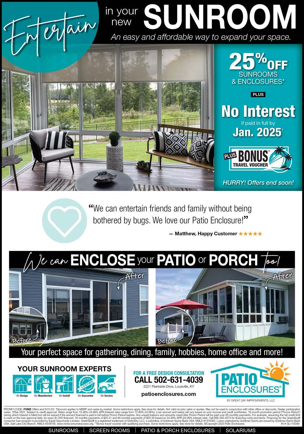 Call Us Today & Invite Us To Your Home For Your FREE CONSULTATION! 502-962-2500 www.EnterpriseHomeImprovements.com "They have the greatest customer experience... Professional... Courteous... Ready to find a solution to meet your need. Their craftsmanship is superior to none. Excellent customer service all the way!" – Duray A. of Bardstown Locally Owned Company 35% OFF YOUR NEXT PROJECT Minimum purchase required. Ask for complete details. Code: FSM0823 *Coupon CANNOT be applied to insurance work. Sorry, no adjustments can be made to prior sales or estimates. *Coupon must be presented at time of initial estimate to be valid. Credit offers subject to approval. *Offer expires 09-30-23.
