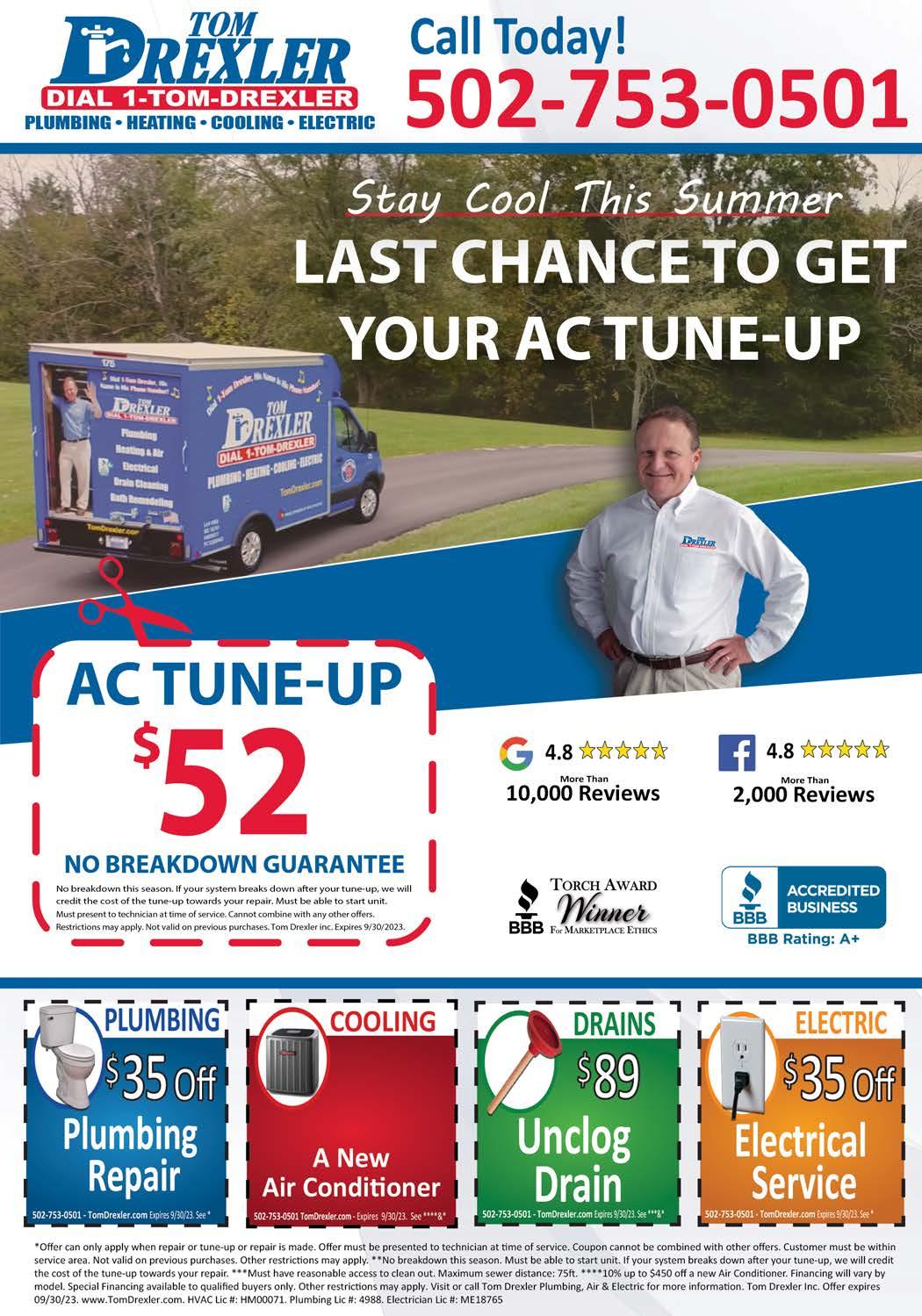 BUY ANY THREE TIRES, GET THE FOURTH TIRE FOR JUST...$1.00 DISCOUNT TIRE OF EQUAL OR LESSER VALUE. Additional labor and parts may be extra. Must present original coupon upon arrival for initial service. Customer is responsible for local tax and shop supplies fee. Valid for most makes and models. See Service Advisor for complete details. Expires 09-30-23. SERVICE: (502) 785-8398 (502) 964-6471 SALES: (502) 785-8360 FRONT-WHEEL ALIGNMENT $8995 Includes Precision-Set Front End Additional labor and parts may be extra. Must present original coupon upon arrival for initial service. Customer is responsible for local tax and shop supplies fee. Valid for most makes and models. See Service Advisor for complete details. Expires 09-30-23. Service contract with synthetic blend motor oil replacement up to 5 qts, oil filter, and 4-wheel tire rotations. Additional charges may apply. Customer is responsible for local tax, shop supplies fee and disposal fees. Valid for most makes and models. Excludes diesel engines. See Service Advisor for complete details. Expires 09-30-23. $6995 SYNTHETIC OIL CHANGE & MULTI-POINT INSPECTION FULL-SERVICE VISIT FOR OR LESS SALES HOURS: Mon.-Sat. 9am–9pm Sunday Noon–8pm $129.95 Value! YOU PAY WHAT WE PAY! YOU PAY WHAT WE PAY! WE OFFER HEAVY-DUTY TRUCK SERVICE! 20% OFF YOUR 1ST REPAIR OR SERVICE Expires 09-30-23 6408 Preston Hwy. SERVICE HOURS: Mon.-Fri. 7:30am–6pm Closed Sat. & Sun. CommonwealthDodge.com VISIT OUR SOCIAL MEDIA ACCOUNTS WITH ANY QUESTIONS ABOUT YOUR VEHICLE OR OUR SERVICES! /Commonwealth Dodge RAM SRT @cwdoffroad cwdoffroad 502-955-8070 Thanks For Voting For Us! "Best Heating & Air Company" 10 years in a row! Proudly serving Shepherdsville and the surrounding areas for over 45 years! Business Hours: Monday-Friday 8am–4:30pm RESIDENTIAL & COMMERCIAL WE SERVICE ALL BRANDS! 401 S. Plum Street | Shepherdsville, KY | www.turnerhvac.com SAVE ON ANY SERVICE! $500 OFF ANY SERVICE OVER $75 $1000 OFF ANY SERVICE OVER $100 $2500 OFF ANY SERVICE OVER $250 With coupon. Not valid with other promotion or offer. Coupon valid on appointments during regular business hours Monday thru Friday 8am to 4:30pm. Expires 09-30-23. TURNER WE'LL KEEP YOUR SYSTEM RUNNING COOL ALL SUMMER LONG!