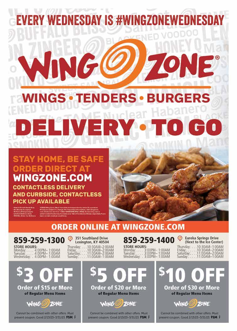©2023 Wing Zone. Each franchise is independently owned & operated. Prices are subject to change. For franchise information, visit wingzone.com. Customer service: 1-866-WINGZONE (946-4966). Consuming raw or undercooked foods may increase your risk of foodborne illness, especially if you have certain medical conditions. ©2023 Wing Zone. Each franchise is independently owned & operated. Prices are subject to change. For franchise information, visit wingzone.com. Customer service: 1-866-WINGZONE (946-4966). Consuming raw or undercooked foods may increase your risk of foodborne illness, especially if you have certain medical conditions. BONELESS WINGS FLAVORED WINGS 30 BONELESS 30 ORIGINAL 100 60 ALL FOR ONLY $79 ALL FOR ONLY $60 Promo Code: 5BIG | EXP: 02/28/2023 Promo Code: 5BIG | EXP: 02/28/2023 580-A Eureka Springs Dr. Lexington, KY 40517 (859) 259-1400 351 Southland Drive. Lexington, KY 40503 (859) 259-1300 ORDER GAME DAY AT WINGZONE.COM