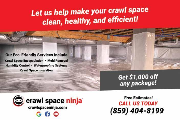 www.landscapinglexky.com mowmows@yahoo.com 859-475-4500 call or text • Residential, Commercial & Equine • Specializing in Landscape Design and Installation • Lawn Maintenance • Retaining Walls, Patios, Decks and Walkways • Spring & Fall Clean Ups • Tree Trimming & Removals • Much More! 12+ Years Experience Family Owned & Operated Expires 3/31/23. 10% off Any Landscape Services $200 New Fence Install up to off Some restrictions apply. X: 3/31/23. 10% off Expires 3/31/23. New Sod Install YOUR RESTORATION & CLEANING EXPERTS. CALL US 859-312-6407 HOW TO PREVENT FROZEN PIPES... and avoid costly repairs when winter arrives We’re here to help! Offering 24-Hour Water Damage Services to get your home or office back to normal. • Drain outdoor water supply lines • Close inside valves providing water to outdoor hose bibs • Insulate water lines in unheated spaces • Leave the garage door shut • Let your faucet drip • Set your thermostat correctly • Add insulation to unheated spaces • Seal any outdoor cracks in your foundation and around outdoor water lines BioCleanKy Locally Owned www.waterdamageprosky.com $500 OFF ANY ESTIMATE OVER $3,000 Must present coupon to get discount. Expires 2/28/23. FSM. $100 OFF ANY ESTIMATE OVER $1,000 Must present coupon to get discount. Expires 2/28/23. FSM. Structural Drying Mold Remediation Crawlspace Restoration & Encapsulation Reconstruction Services Water Extraction CALL 859-327-3212 M-F FOR A FREE QUOTE. 10% OFF FOR SENIORS & MILITARY EVERY DAY! Powder coating is more durable than paint, and, with low VOC’s, is also environmentally friendly. Once your part is powdered, we bake it in our oven for a very strong and durable finish. We can powder coat anything that is metal, from aluminum cups to patio furniture to auto parts. We can even powder your truck or motorcycle frame. WELDING/FABRICATION MEDIA BLASTING Good through 3-6-2023. FSM