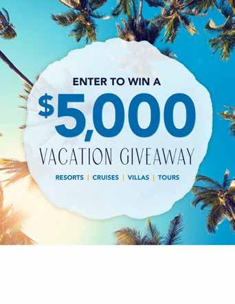 NO PURCHASE NECESSARY. A PURCHASE WILL NOT INCREASE YOUR CHANCES OF WINNING. Open to legal residents of the 50 United States (D.C.) 18 years of age and older. Void where prohibited. Sweepstakes begins 01/16/23 and ends 04/16/23. For Official Rules, prize descriptions and odds disclosure, visit www.jdoe. dreamvacations.com/contest. Sponsor: World Travel Holdings, 1201 W. Cypress Creek Road, Suite 100, Fort Lauderdale, FL 33309.