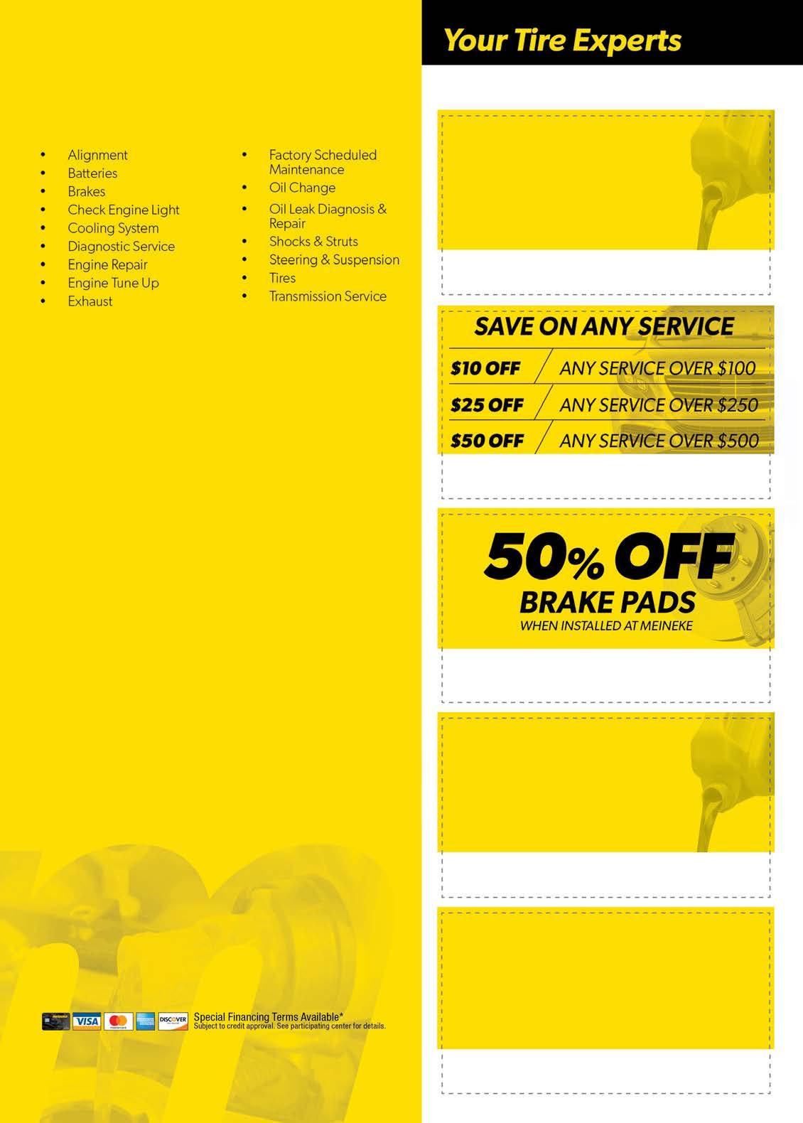 EXPIRES NOVEMBER 30, 2023. EXPIRES NOVEMBER 30, 2023. Includes up to 5 quarts of Duramax 5W20 or 5W30 Synthetic BLEND oil and standard oil filter. Special oils and filters are available at an additional cost. See** for additional disclaimers. Not valid on the sale or tires, batteries, or special order parts. See ** for additional disclaimers. Valid only with purchase of brake pads when installed at Meineke. Service must include any parts or service required to restore the system to proper operating conditions; additional parts and services may be required at an additional cost. Excludes special order parts. See ** for additional disclaimers. $1995* STANDAND OIL CHANGE *WITH MEINEKE CARD APPLICATION INCLUDES OIL, FILTER & FULL DIGITAL INSPECTION EXPIRES NOVEMBER 30, 2023. Includes up to 5 quarts of Duramax OW20, 5W20 or 5W30 FULL SYNTHETIC oil and standard oil filter. Special oils and filters are available at an additional cost. See** for additional disclaimers. $5995 FULL SYNTHETIC OIL CHANGE INCLUDES OIL, FILTER & FULL DIGITAL INSPECTION We Offer Financing! From good credit to no credit... Special Financing options are available. EXPIRES NOVEMBER 30, 2023. FREE TIRE ROTATION WITH ANY OIL PACKAGE! FREE TIRE ROTATION WITH ANY OIL PACKAGE! EXPIRES NOVEMBER 30, 2023. INDIANA Charlestown 321 Market Street (812) 406-0046 New Albany 3723 Charlestown Rd. (812) 590-4025 KENTUCKY Downtown 701 E. Broadway (502) 403-2184 Buechel 4170 Bardstown Rd. (502) 403-2313 Pleasure Ridge Park 5326 Dixie Hwy. (502) 403-2231 Okolona 7103 Preston Hwy. (502) 403-2183 Highview 6420 Outer Loop (502) 403-2291 Radcliff 2197 South Dixie Blvd. (270) 506-0123 Middletown 11514 Shelbyville Rd. (502) 792-8786 St. Matthews 3949 Shelbyville Rd. (502) 631-9912 Dupont 1019 Dupont Rd. (502) 897-1643 Elizabethtown 1400 N. Dixie Hwy. (270) 506-4685 Shelbyville 2000 Midland Trail (502) 354-5064 Call for Saturday availability. Buckner 3717 Hwy. 146 (502) 565-4286 Store Hours: M-F 7:30am–6:00pm Sat. 7:30am–4:00pm Jeffersontown 10723 Plantside Dr. (502) 536-9765 Call for Saturday availability. **Offers valid on most cars and light trucks at participating Meineke U.S. locations. Discounts apply to regular retail pricing. One offer per service per vehicle. Offers cannot be combined with other specials or warranty service. Additional shop supplies or disposal fees may apply. Coupons have no cash value and must be presented at time of estimate. See the center manager for any additional details. Void where prohibited. Limited time offer. ©2023 MCCCI Save Time... Schedule Your Appointment Online at Meineke.com Costs will apply for parts and service needed to repair the system. See ** for additional disclaimers. $20 OFF COOLING SYSTEM FLUSH EXTEND THE LIFE OF YOUR ENGINE WITH SEASONAL COOLING SYSTEM SERVICE! PREVENTS OVERHEATING, RESTORES COOLANT FLOW & REMOVES DEPOSITS.