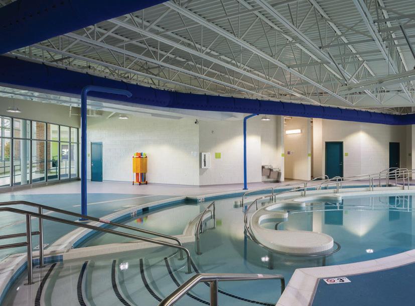 A therapy pool features an ADA ramp for wheelchair entry, a hoist and a chair lift for full accessibility.
