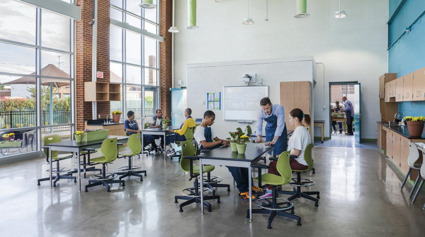 Instead of traditional classrooms, River Terrace features oversized classrooms with custom furniture to accommodate wheelchairs and technologies to aid students with hearing difficulties, helping them to better understand their teachers.
