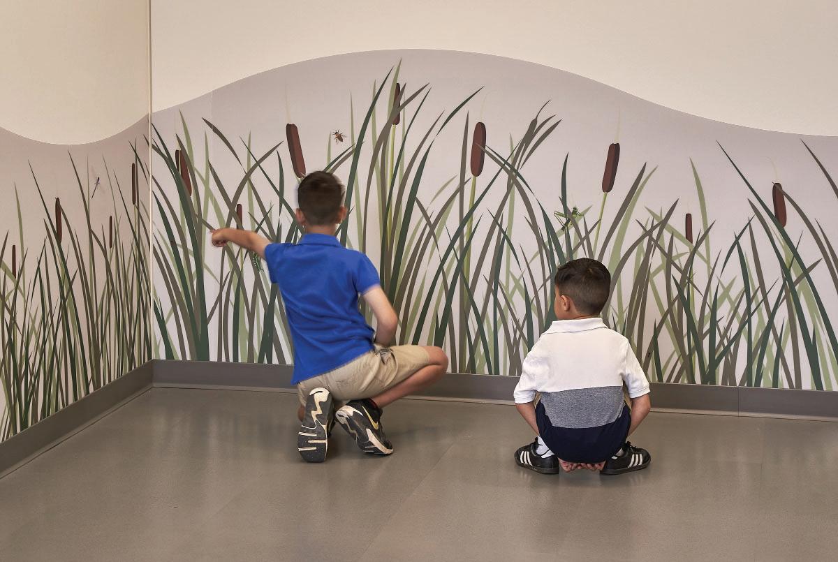 Wall panels let students discover images of plants and insects native to the area.