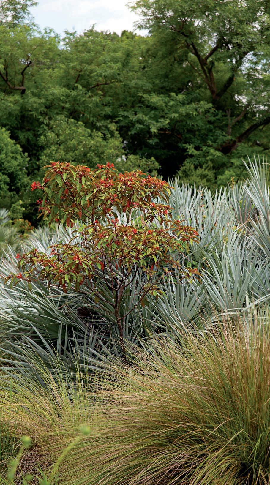 A scene from Bok Tower Gardens, in Lake Wales: three readily available and easily maintained native species add volume, texture and color to this space. In the foreground, sand cordgrass, Spartina bakeri; in the middle, firebush, Hamelia patens, contrasting beautifully with the silver saw palmetto, Serenoa repens 'Silver', in back. These choices will work in north, central and south Florida, and provide food and cover for pollinators and birds. Just a few plants are needed to fill a large space when you consider the mature sizes of these species. One silver saw palmetto shrub will reach 3-8' in height and spread. A firebush will grow 3-10' high, taller in South Florida than north, and spread 3-6' across. A single cordgrass can reach 3-5' in height and spread. If you start with small plants, as most of us do, just fill the spaces with wildflowers and mulch until your big plants reach maturity.