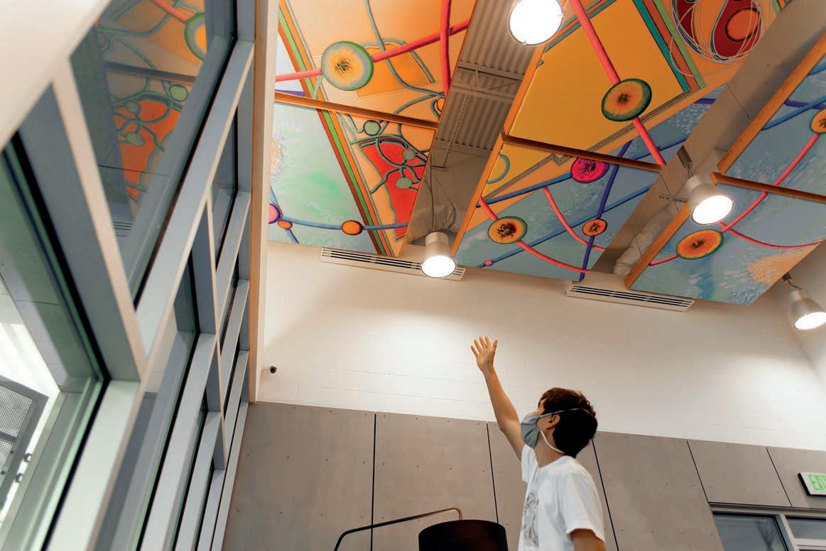 Artist Evan Galbicka points to his installation which maps the grounds and the “pollinator flight paths” he used for organizing the landscape design.