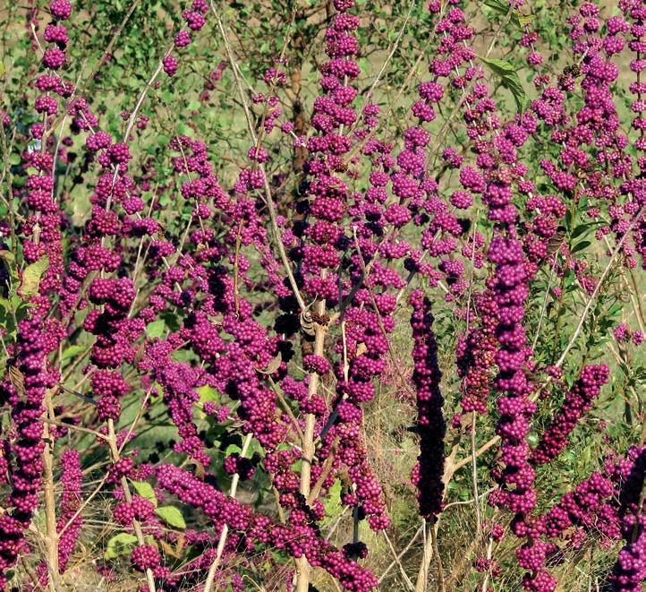 Looking for fall color? Consider the magenta fruit clusters of American beautyberry. Birds eat the fruit and the tiny light pink flowers that precede the fruit are attractive to small bees.