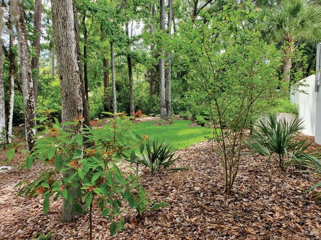 Landscape architect Larry Teague, owner of FANN member Zamia Design in Gainesville, Florida, combines native and Florida-friendly plants to help traditional clients move in a more ecological direction. On this project, Zamia Design was brought in after constru ction, a common mistake that can result in significant overspending on problems best solved by plants. This very large yard is sloped dramatically downward from the front to the back. Larry designed planted terrace walls to soften the drop from the pool, and had this been designed at the outset, the costly custom cable fencing securing access to the pool could have been omitted. The sloped landscape combined with underlying clay and inadequate 4" pipe resulted in Zamia Design installing a “dry creek” bed to divert stormwater. Large 65-gallon trees were brought in to provide immediate screening of an undesirable view behind the house.