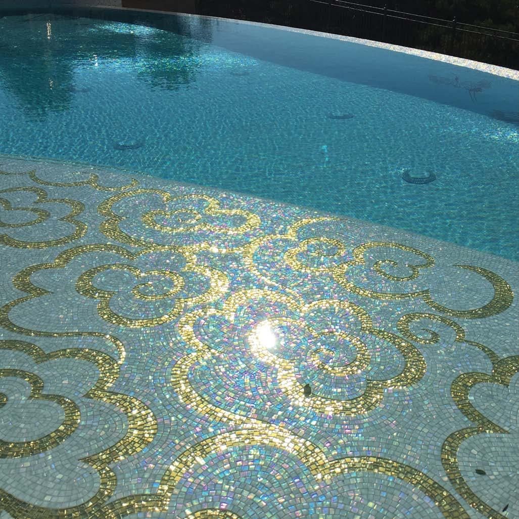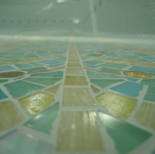 Following the handcrafted traditions of the past, new techniques and methodologies are carefully chosen by Fantini Mosaici and incorporated into processes. For example, the cutting of stones and even glass is now accomplished with high-pressure water jets. This innovation leaves a smoother surface that requires less finishing without waste and, more importantly, eliminates harmful dust and toxic fumes to make for a safer work environment. The company has also developed an innovative process for sealing gold within glass tiles and for creating luminescent colours of glass.
