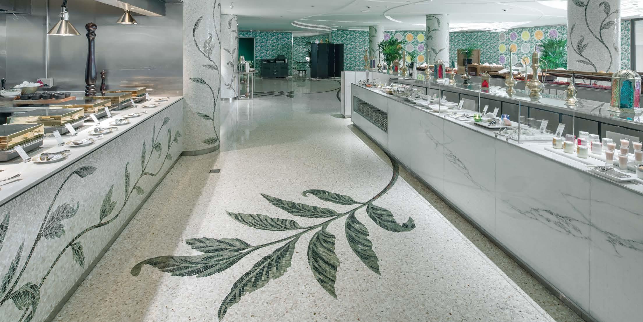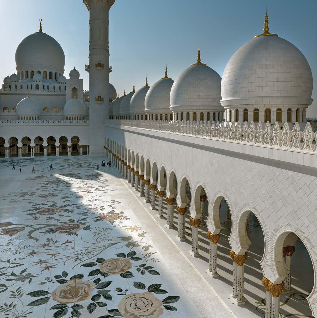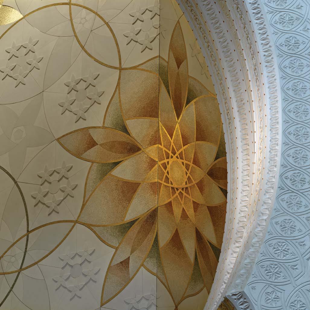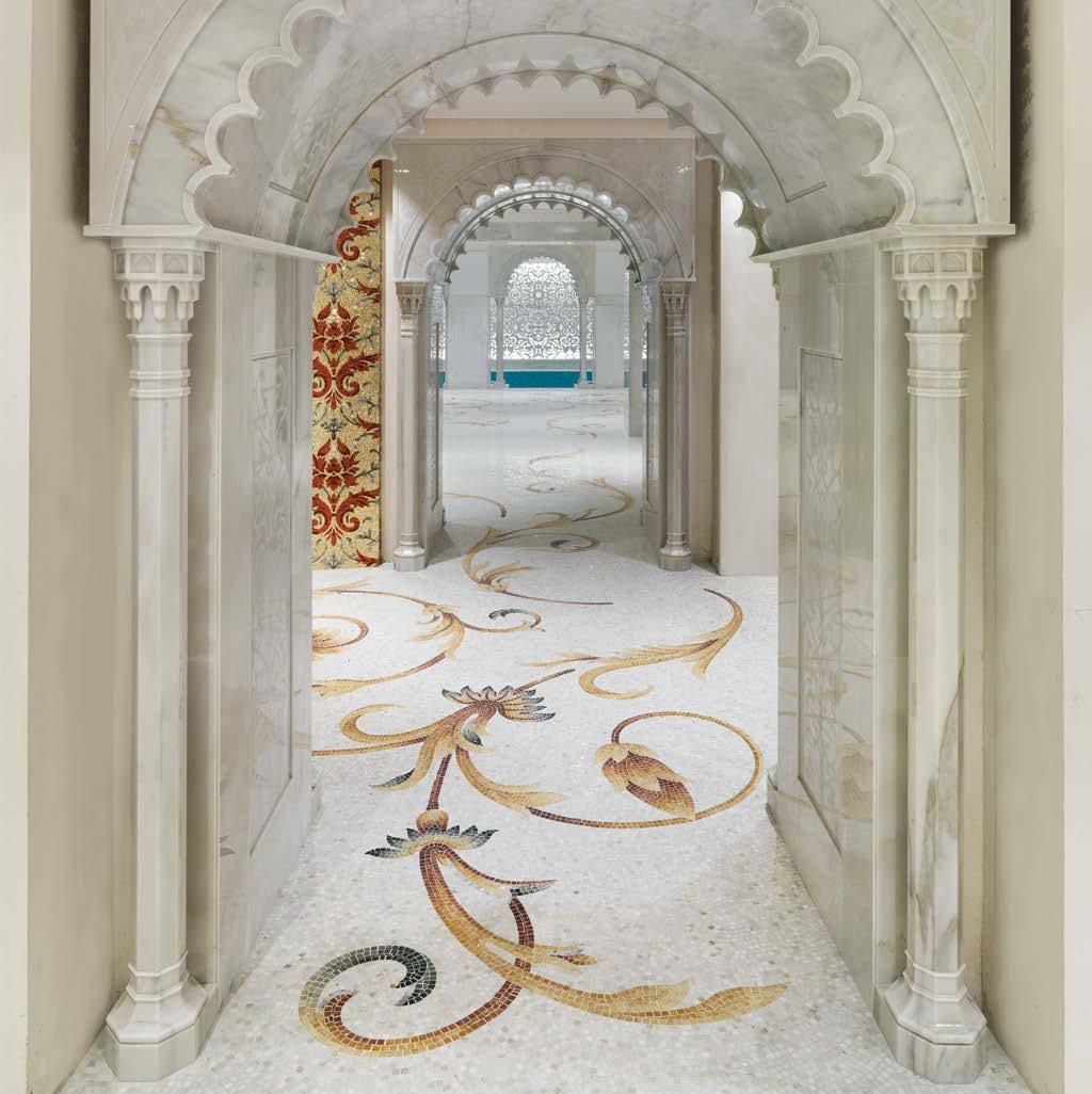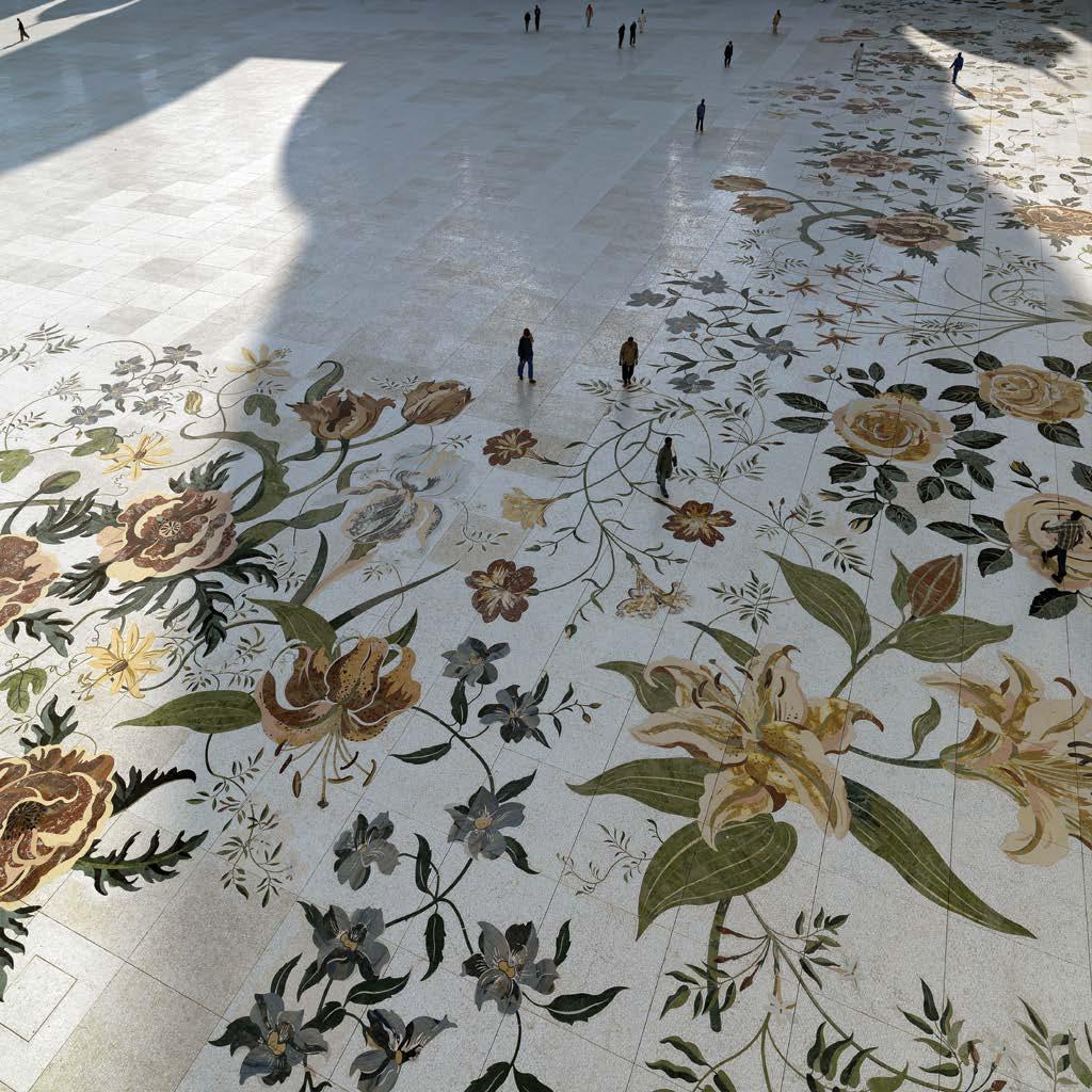 Ci si riferisce talvolta alla Sheikh Zayed Grand Mosque ad Abu Dhabi come alla ‘Moschea dei Fiori’ per via dei vibranti motivi floreali che ricoprono per intero il sahan (cortile), che si estende per 17.500 metri quadrati — il più grande mosaico al mondo, realizzato da Fantini Mosaici. Una forma d’arte antica che risplende di un’aura contemporanea, derivante dall’utilizzo di marmi internazionali tagliati con grande precisione e di pietre semipreziose. Ingegneri specializzati hanno supervisionato ad Abu Dhabi l’assemblaggio di pannelli di elaborati mosaici fatti in Italia, alcuni con un margine di errore di appena 5 mm.