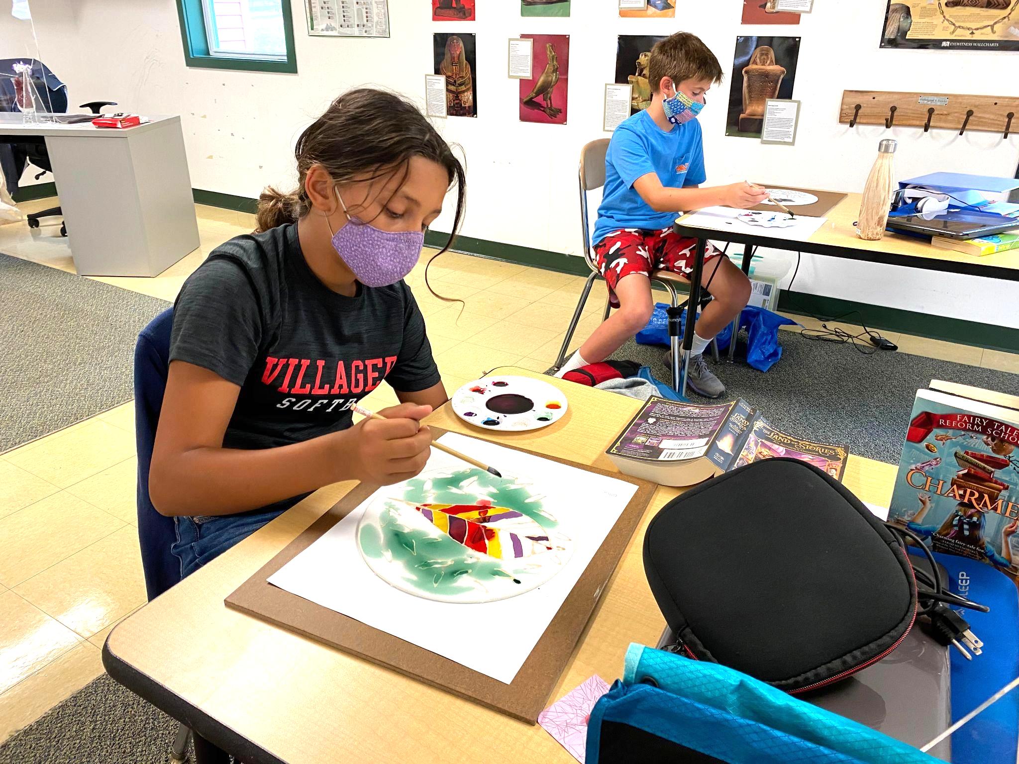 Art: Inspired by the works of Modernist painter, Georgia O'Keeffe, Fourth Grade explores the natural world around them by looking closely and imaginatively, as artists do. Starting in pencil and watercolor paint, students develop their eye for detail and balance, while at the same time developing their use and handling of the media itself. Students are encouraged to push their ideas around composition and perspective beyond the ordinary. Upon mastering works on paper, students expand their artistic visions onto silk fabric. In our final module, students develop the basic techniques of the resist method of silk painting. From blending and mixing colors, to applying detailed resist lines to raw habotai, students create