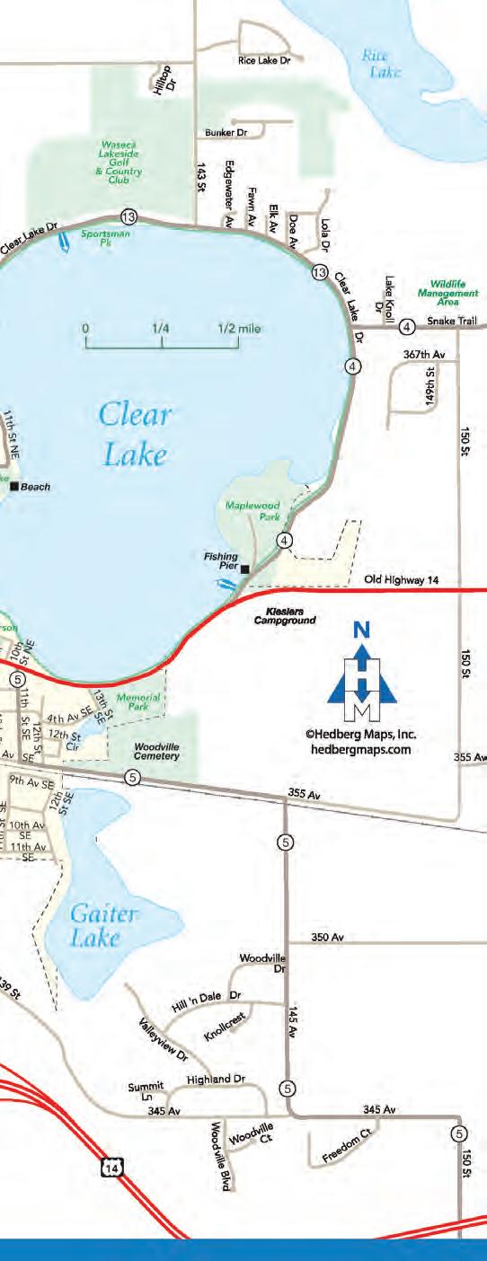 Additionally, there are 50 lakes within a half-hour drive: Lake Elysian near Janesville, Reeds Lake west of Waseca, St. Olaf Lake outside of New Richland, Lake Francis in Elysian, and Tetonka and Sakatah lakes in Waterville.