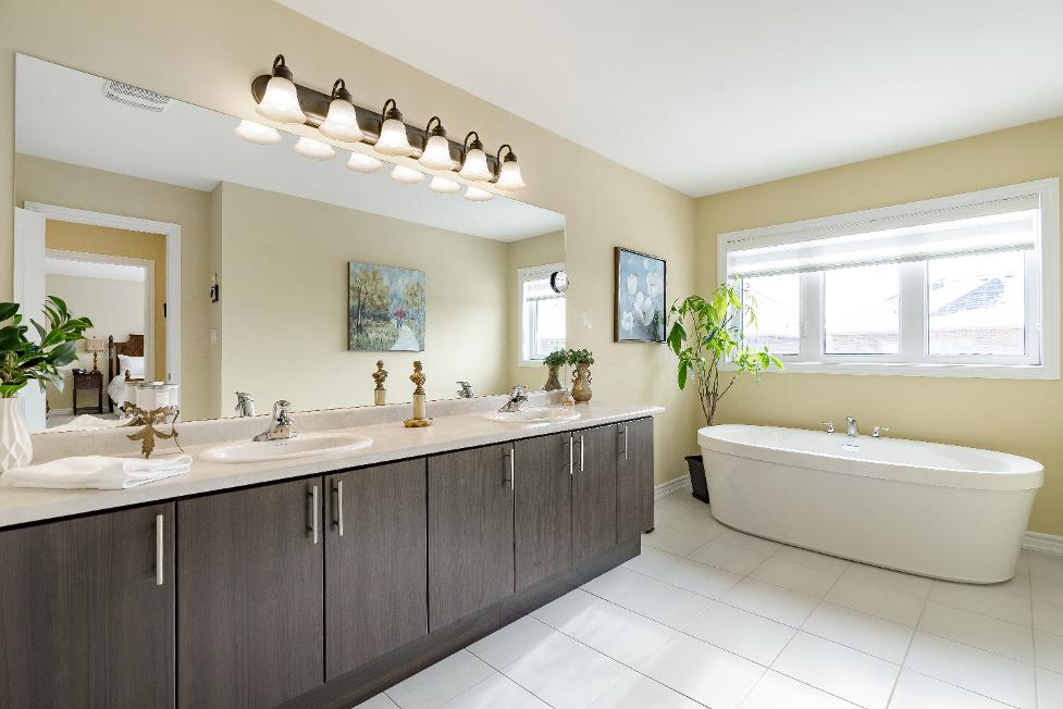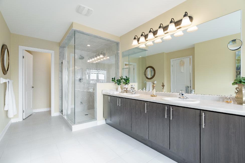 - Oversized vanitywith dualsinks and plentyof under-sinkstorage