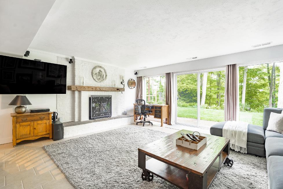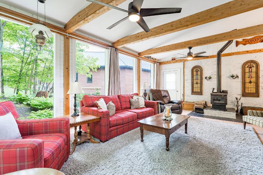 Enjoythe beautyof everyseason from the show-stopping sunroom,whereexpansive windowsfillthe spacewith naturallight,two ceiling fansadd comfort,a wood stove providesa cozywarmth in the winter,and a garden dooropensto the backyard,seamlessly connecting indoorand outdoorliving