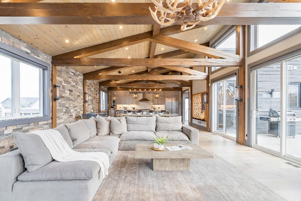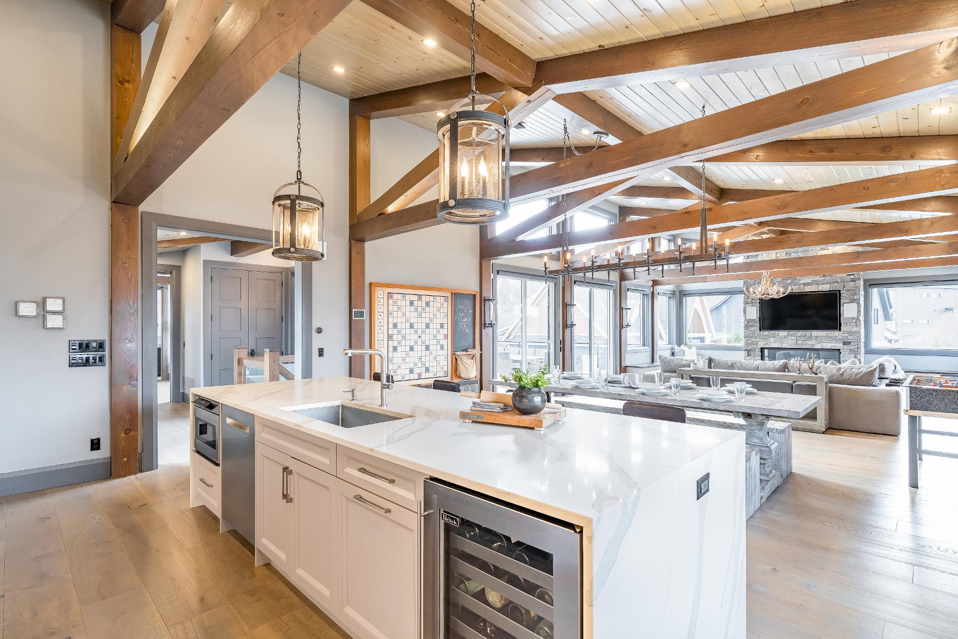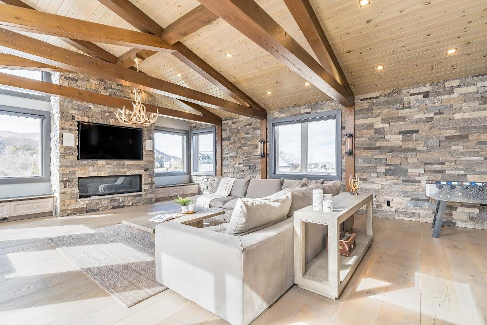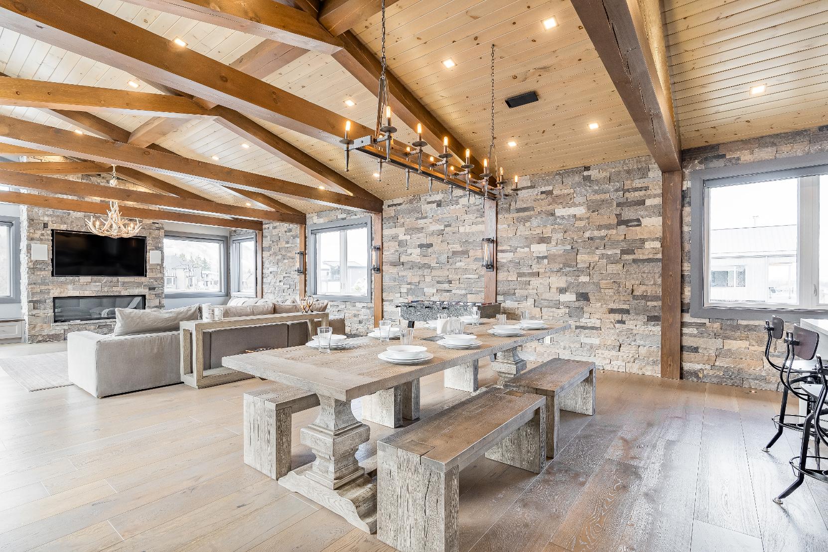 Distinctivearchitecturaldetailselevatethe interior,including dramatic vaulted ceilings,exposed beam trusses,reclaimed wood accent walls,and a striking floor-to-ceiling stone fireplace anchoring the main living space,along with wide-plank custom hardwood floors, quartzcountertops,solid wood doorsand trim,televisionsintegrated into select showers,wall-hung toilets,and subtlein-floorlighting enhancing the refined design