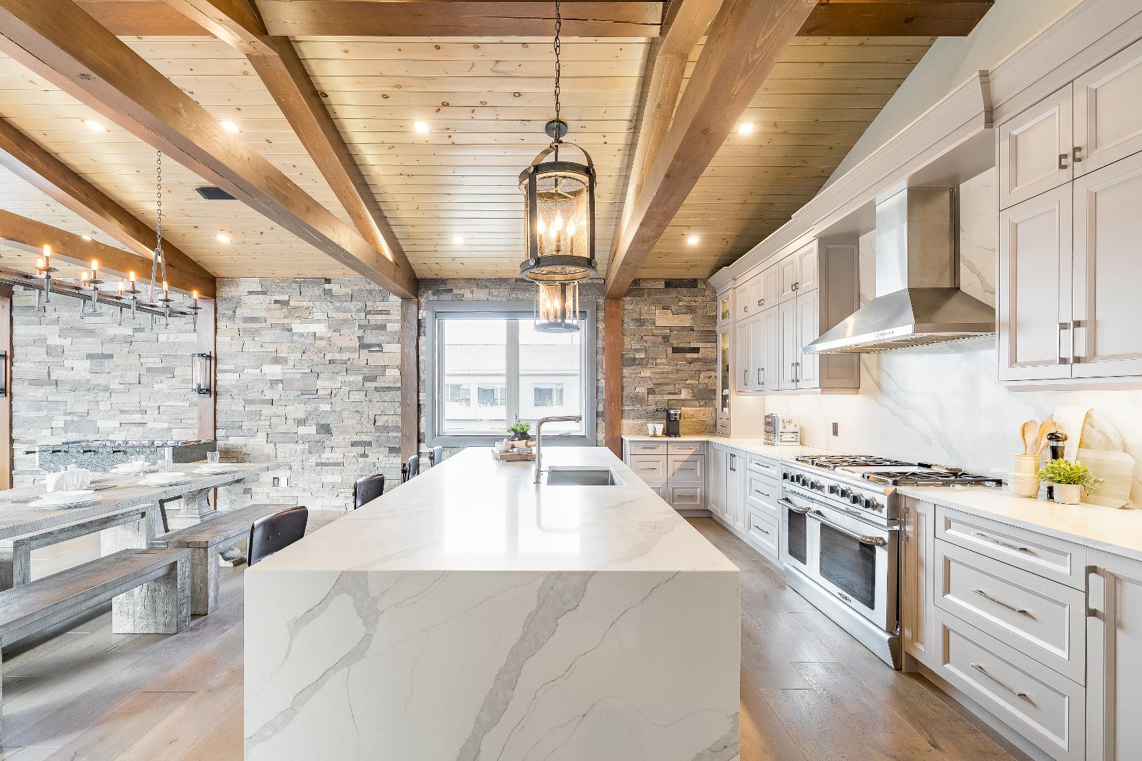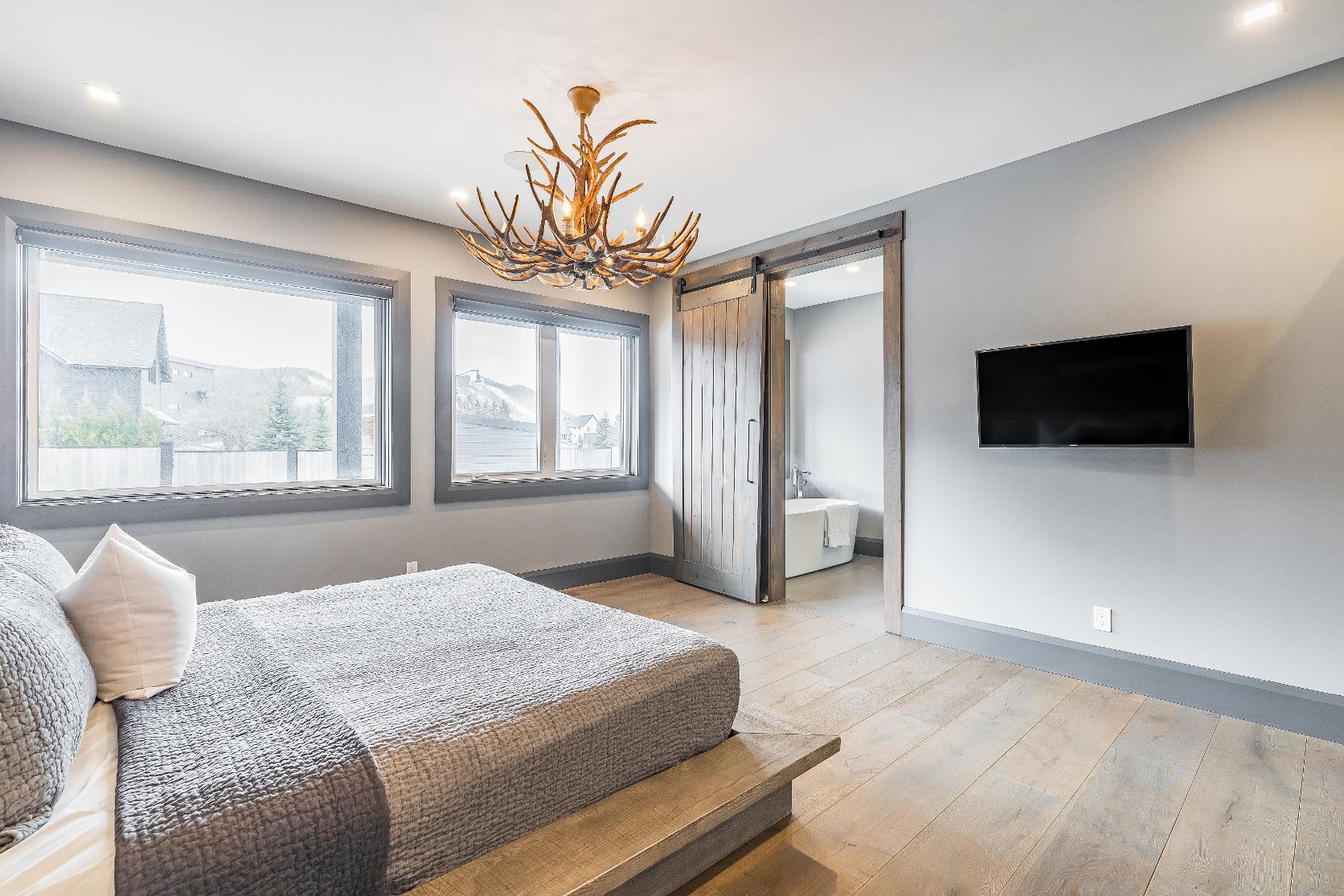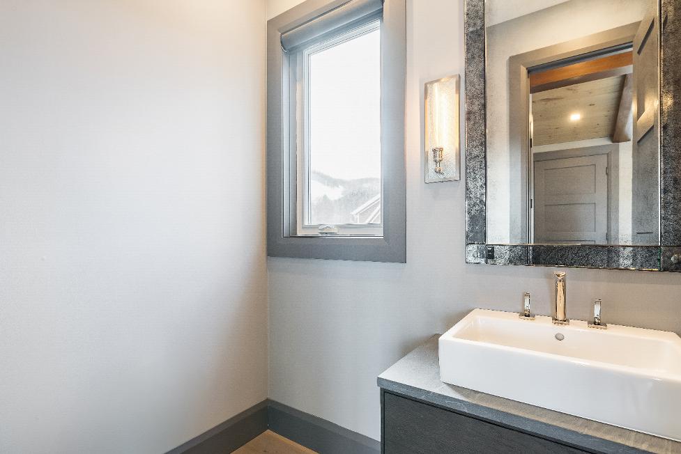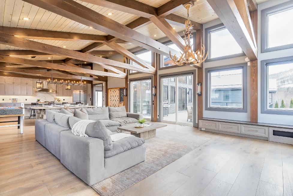 Distinctivearchitecturaldetailselevatethe interior,including dramatic vaulted ceilings,exposed beam trusses,reclaimed wood accent walls,and a striking floor-to-ceiling stone fireplace anchoring the main living space,along with wide-plank custom hardwood floors, quartzcountertops,solid wood doorsand trim,televisionsintegrated into select showers,wall-hung toilets,and subtlein-floorlighting enhancing the refined design