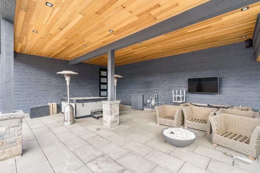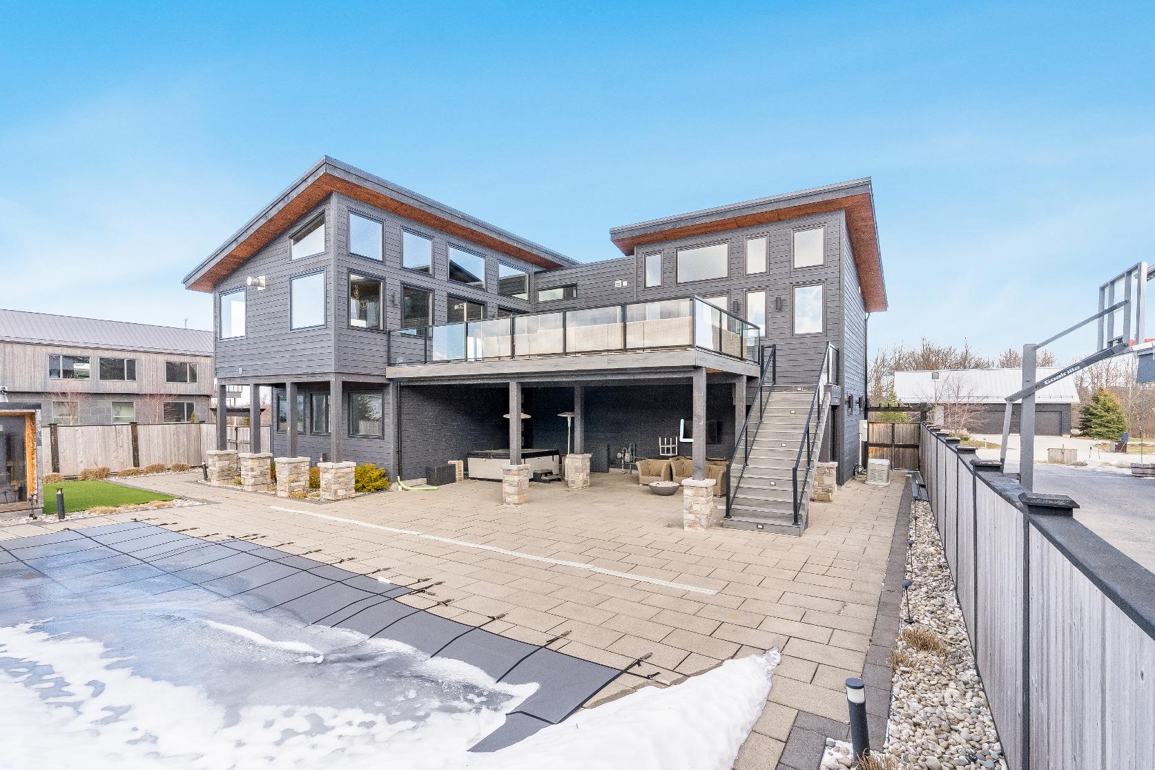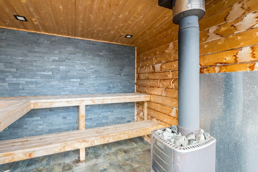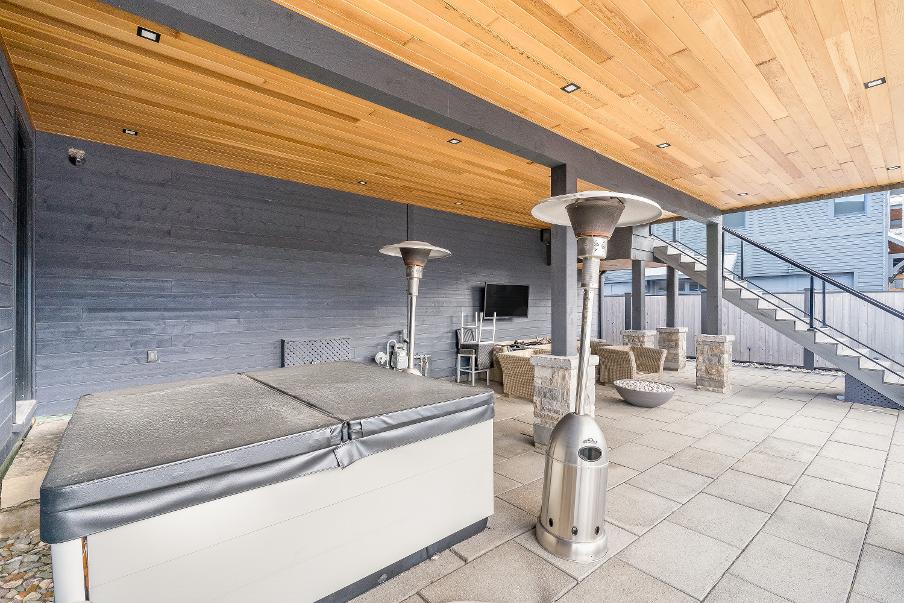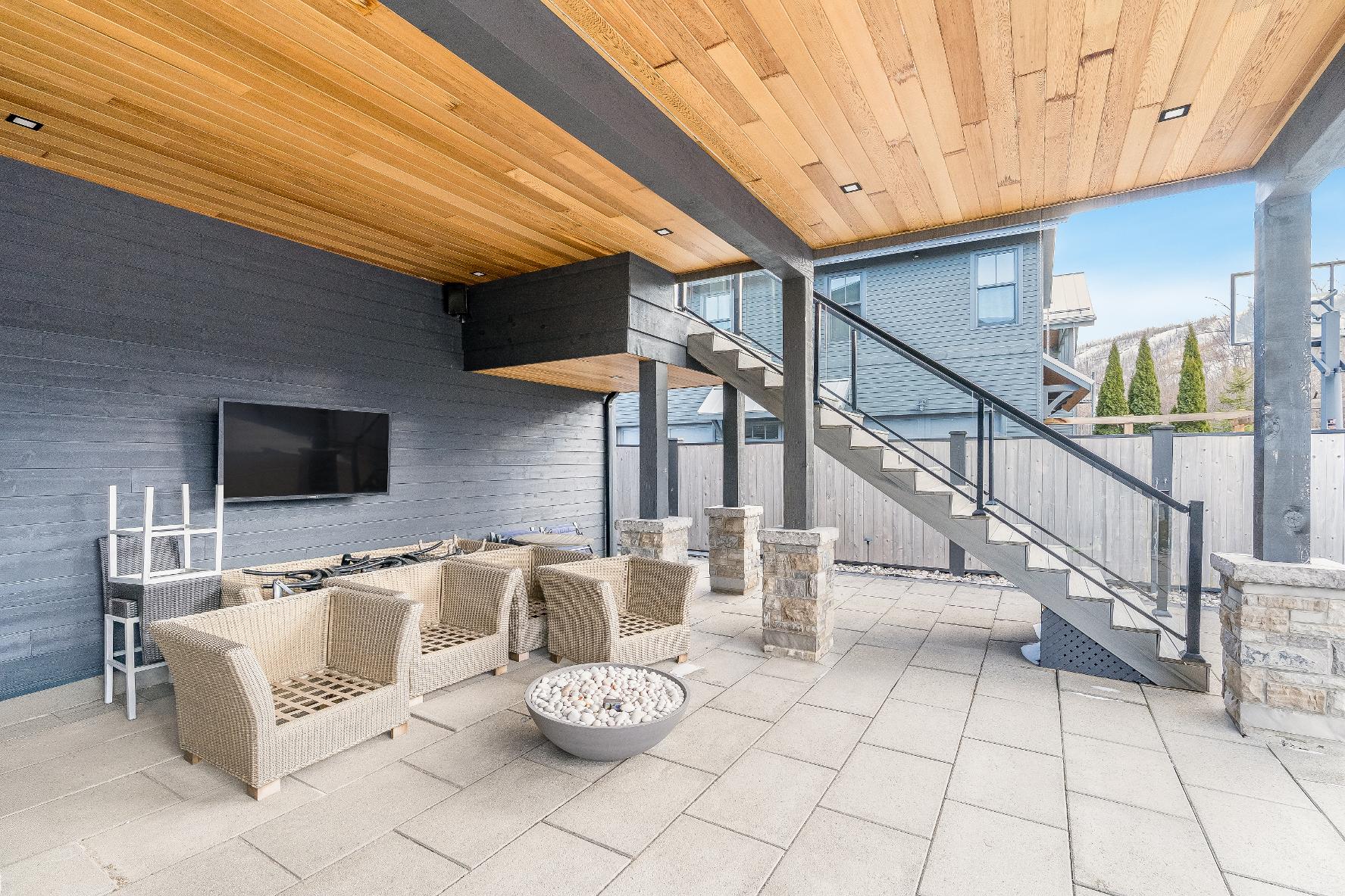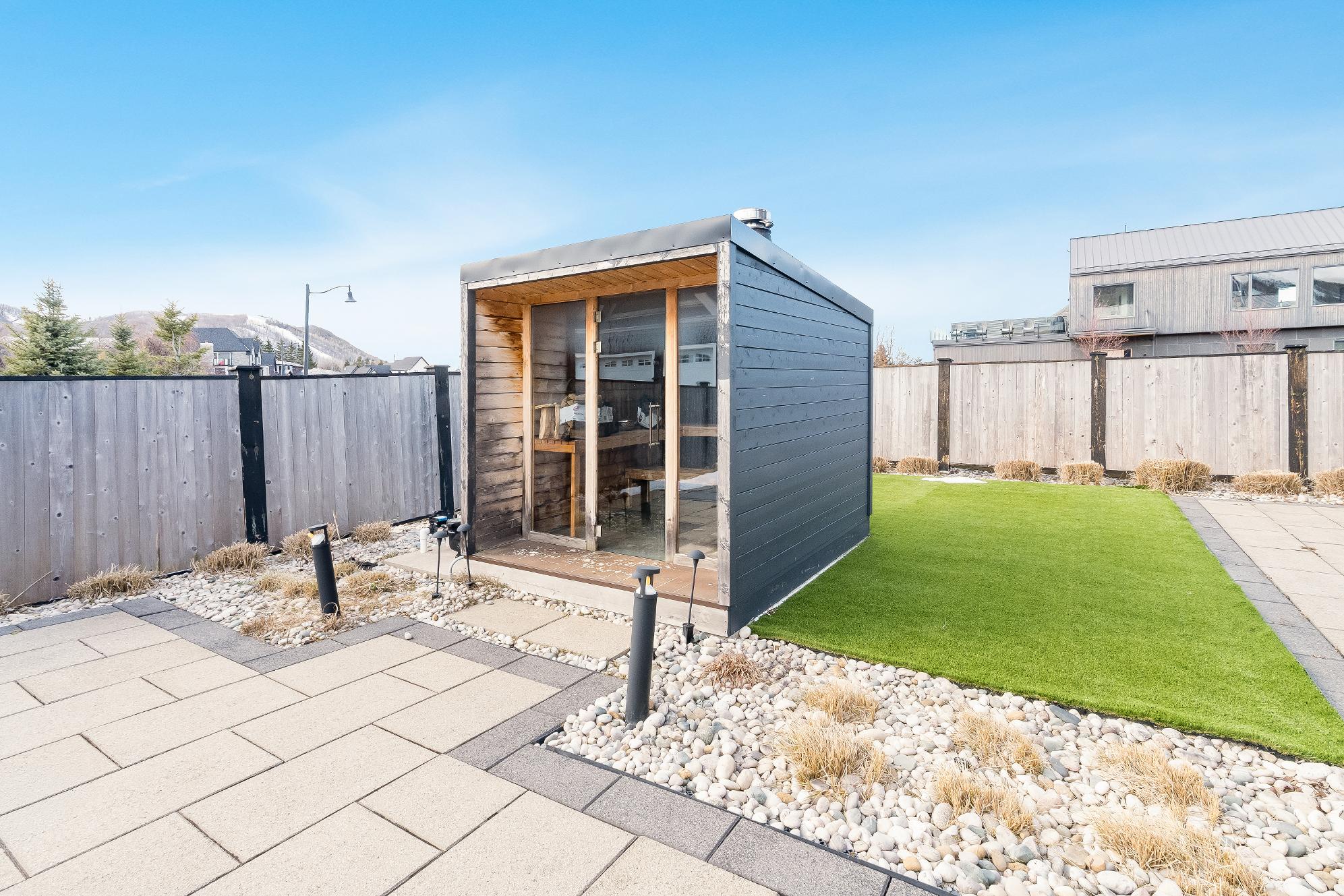 - Unwind in yourfullyfenced backyard oasisfeaturing an expansive deckoverlooking skihill views,37?x14?heated saltwater fibreglasspool,Bullfrog STILhot tub, wood sauna,and covered entertainment area complete with naturalgasfirefeature and outdoortelevision