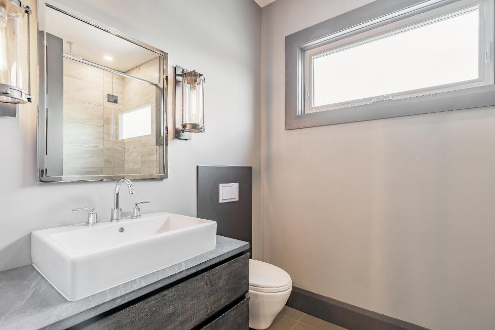 - Modern floating vanityfeaturing a vessel sink,beautifullyilluminated bystylish sconcelighting