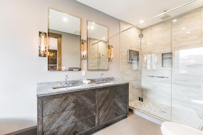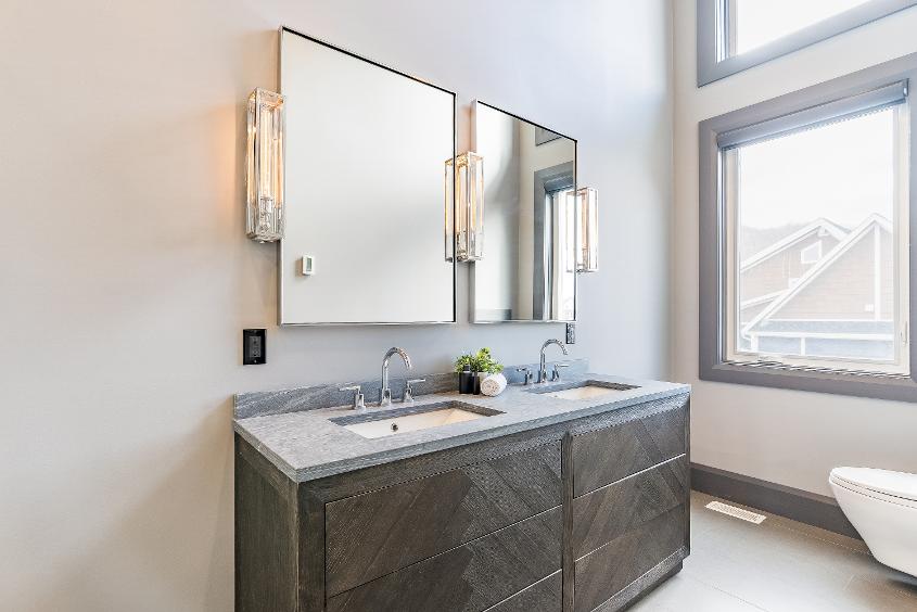 - Deep-toned dualsinkvanitywith a quartzcountertop