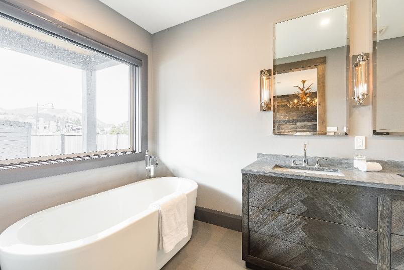 - Freestanding soakertub with a floor-mounted faucet situated belowa bright window