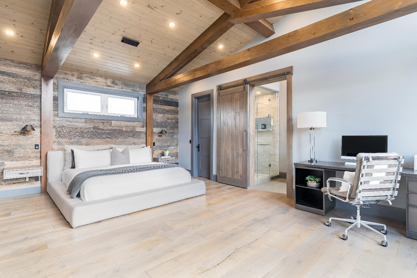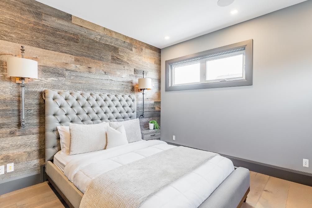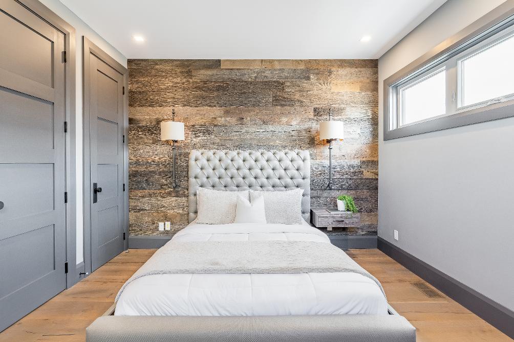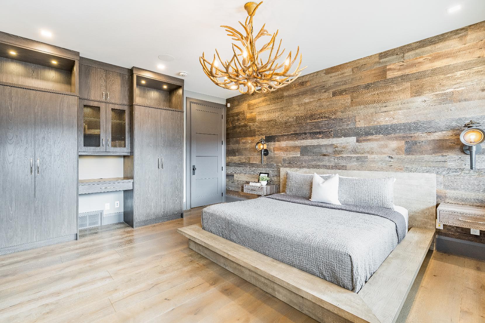 - Reclaimed wood feature wallcomplemented bywall-mounted sidetables,perfectly positioned to showcase a king-sized bed