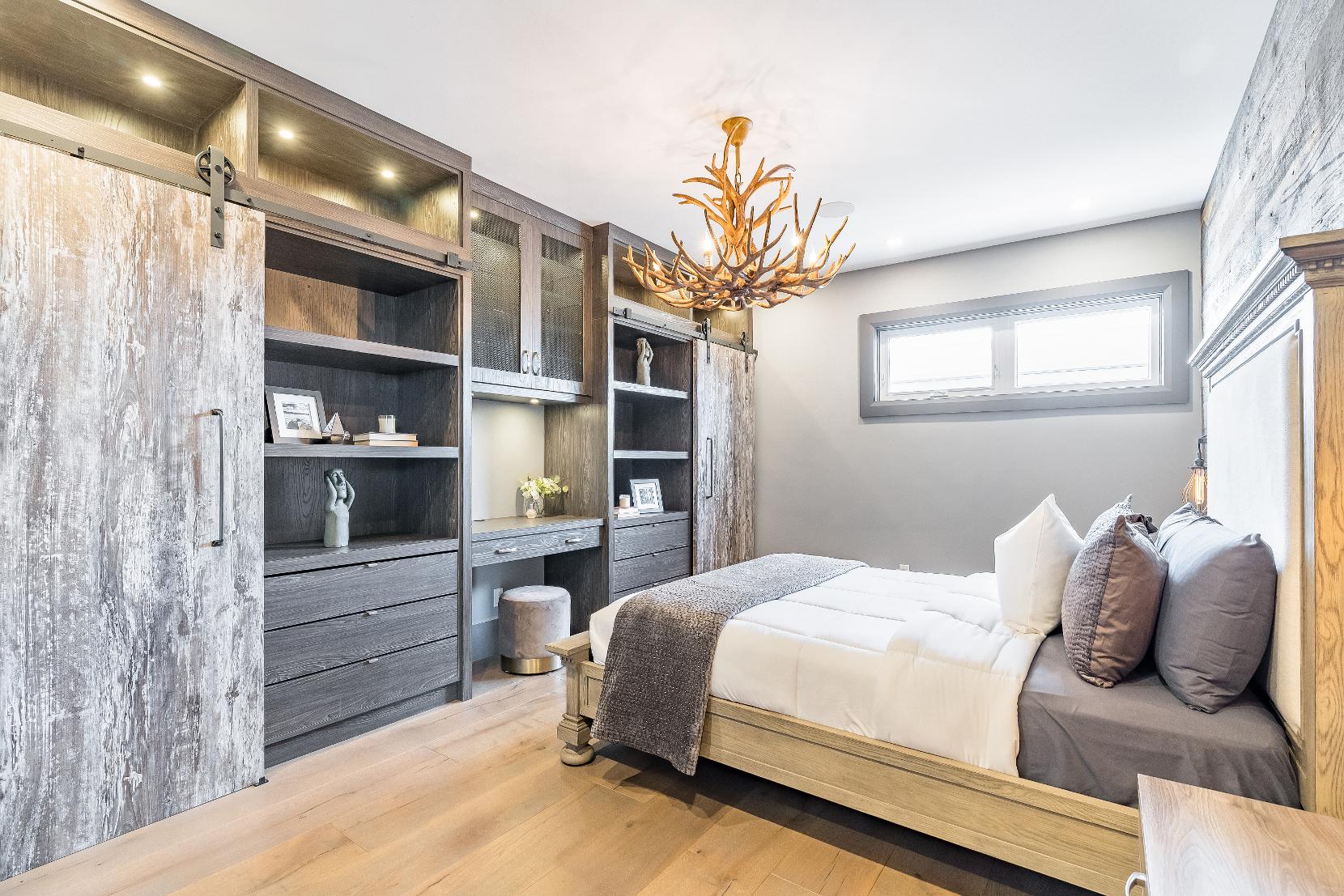 - Built-in wardrobeand desk featuring a barn doors, integrated lighting,and glass-fronted accents