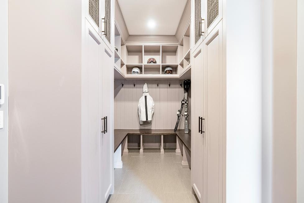 - Arrayof built-incabinetry including cubbiesand a wraparound bench