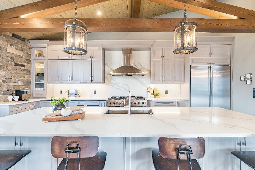 - Impressive 11'x4'statement island showcasing a beautifulcascade countertop, stainless-steelsink,and breakfast barseating