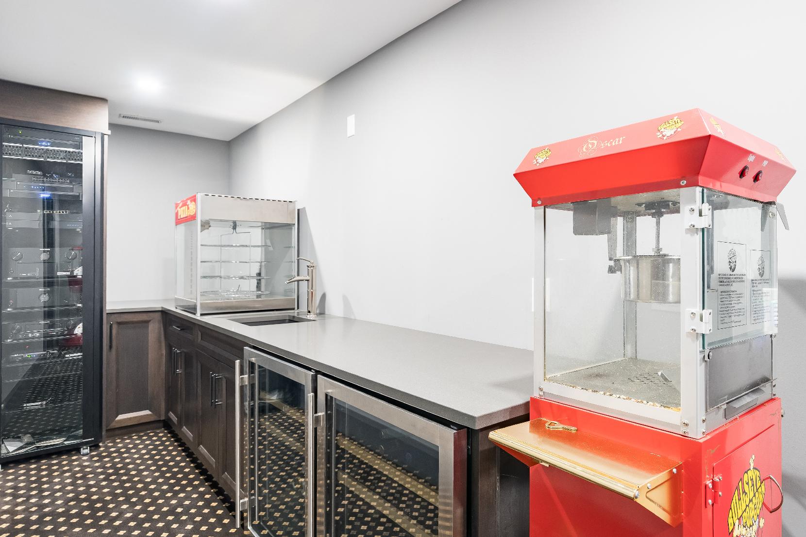 - Concession barfeaturing a sink, quartzcountertop,and two beveragefridges
