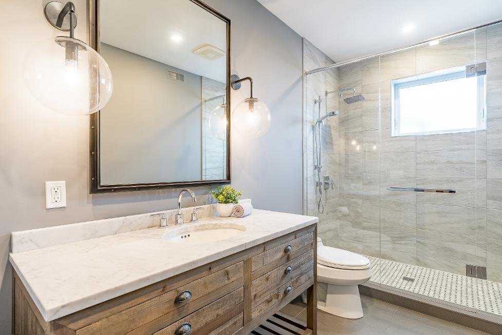- Modern quartz-topped vanity with a vesselsink