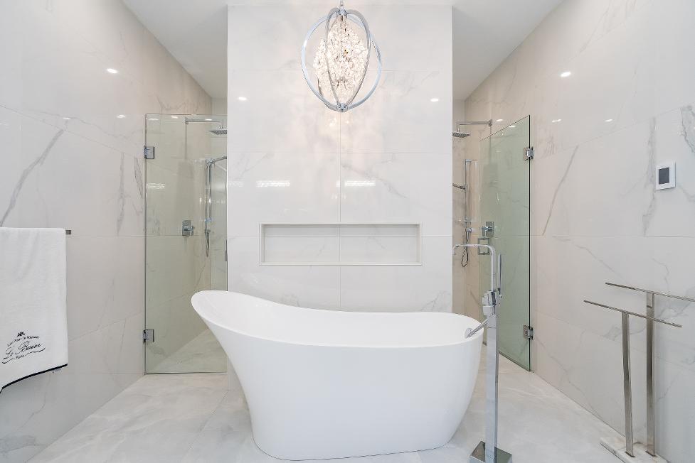 - Freestanding bathtub with an overhead built-inniche
