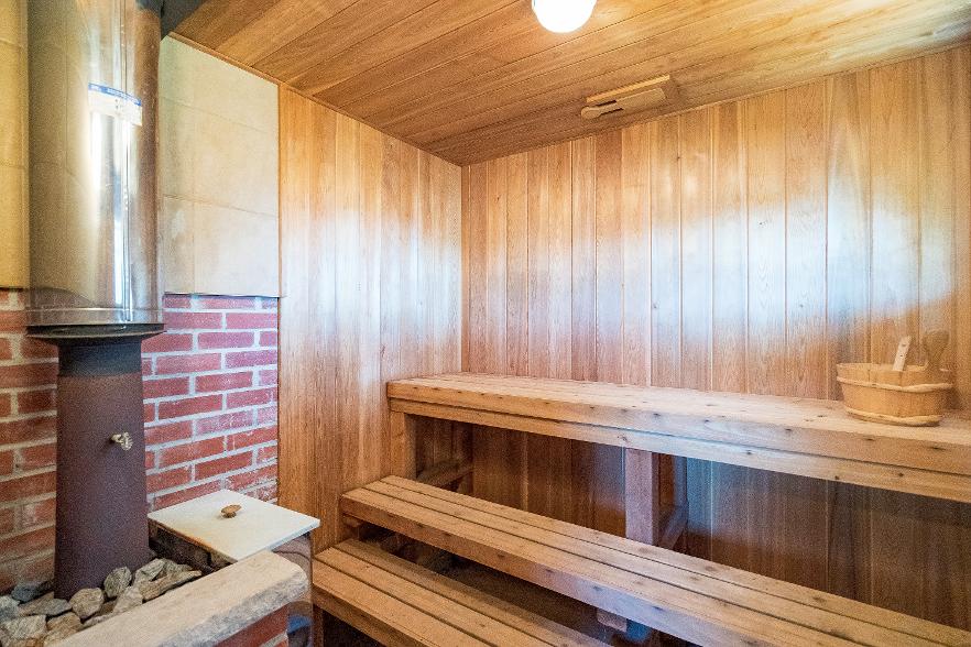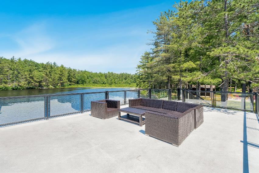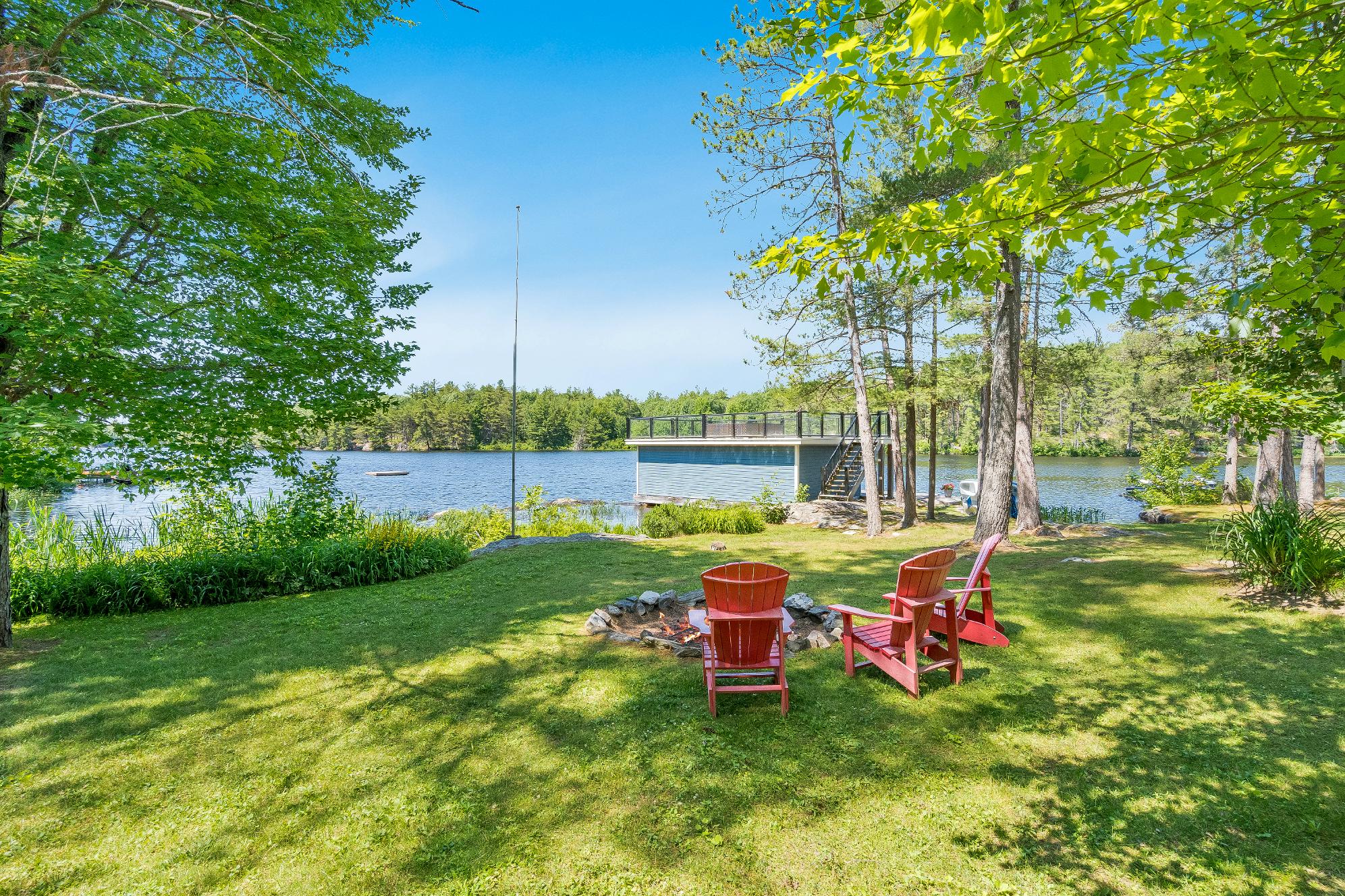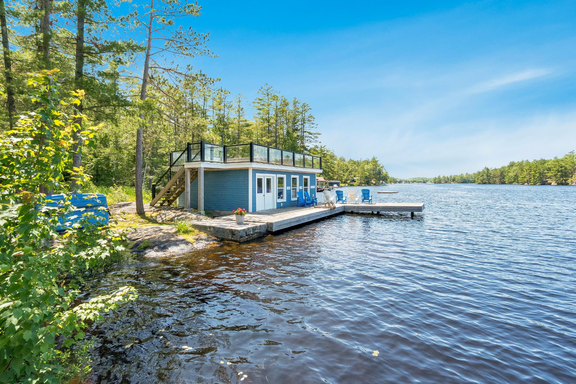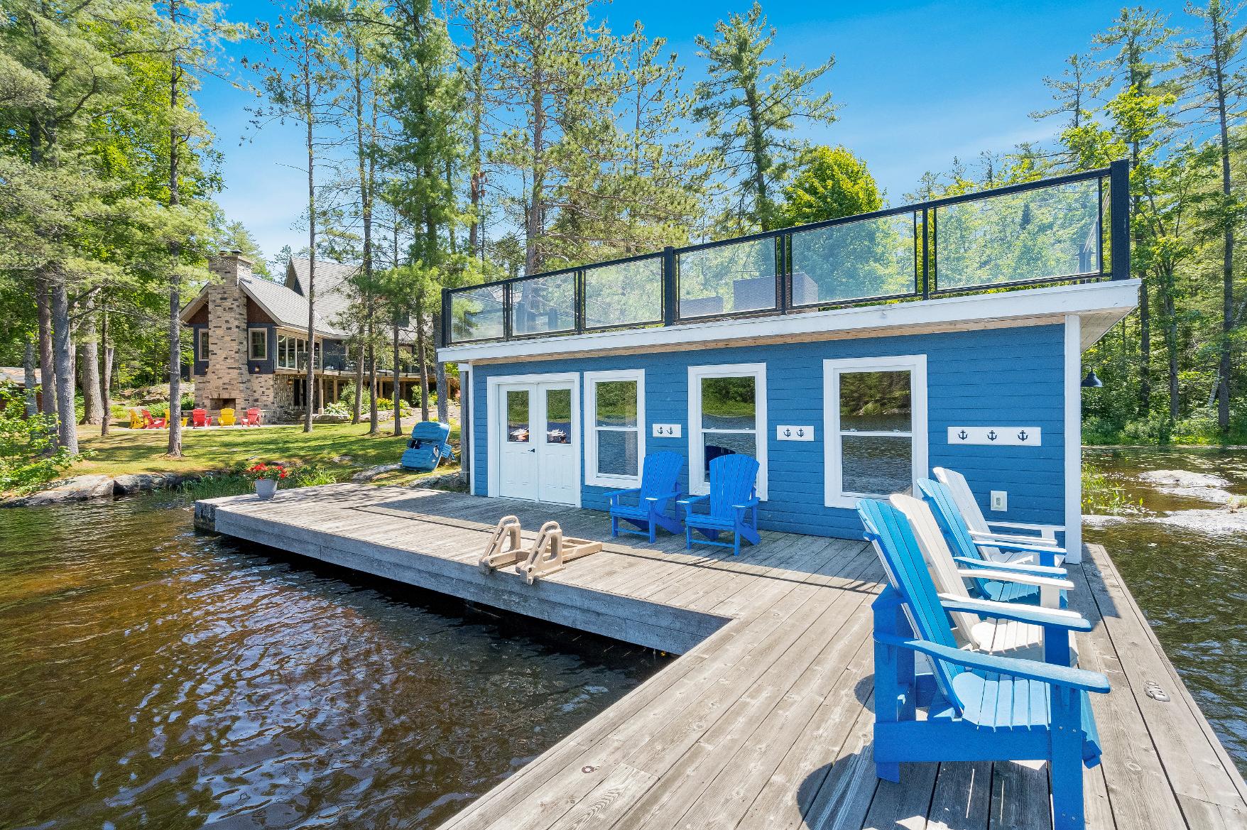 showcasing an 8'x12'wood fired sauna with a change room,an outdoorfireplace,an expansive deckadorned with glass-railingsfor unobstructed views,and a boathousewith a second leveldeck offering front rowseatsto beautiful waterviews