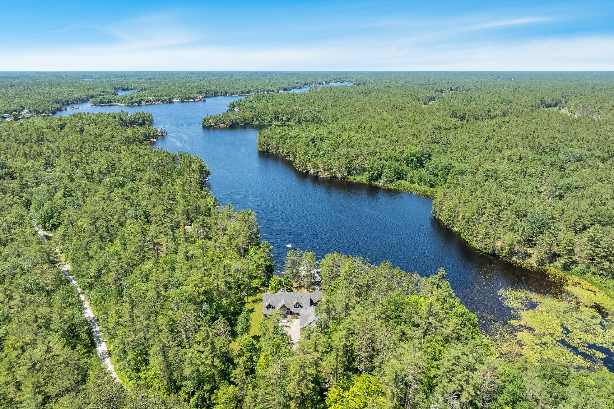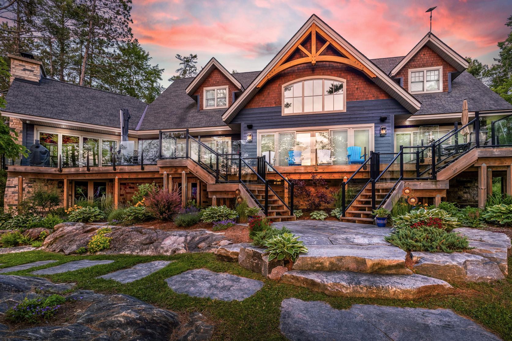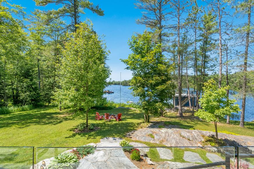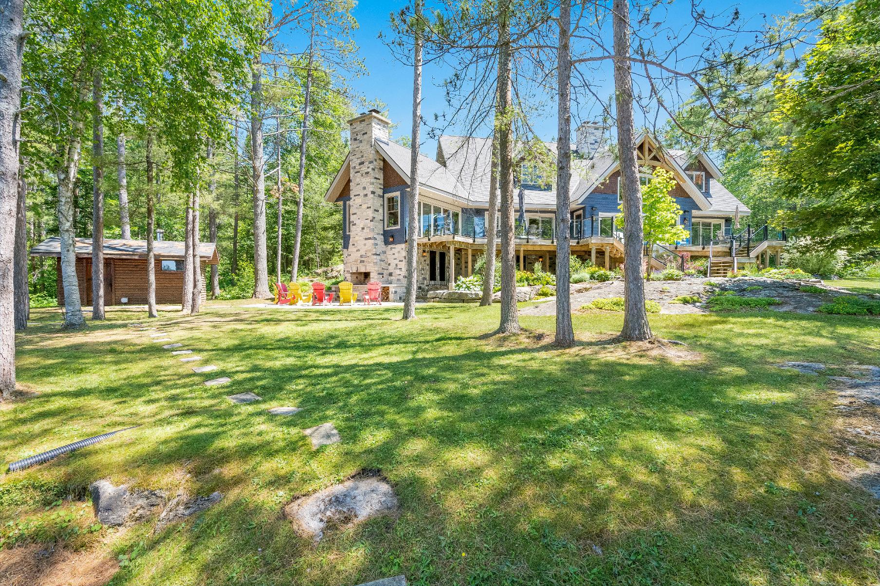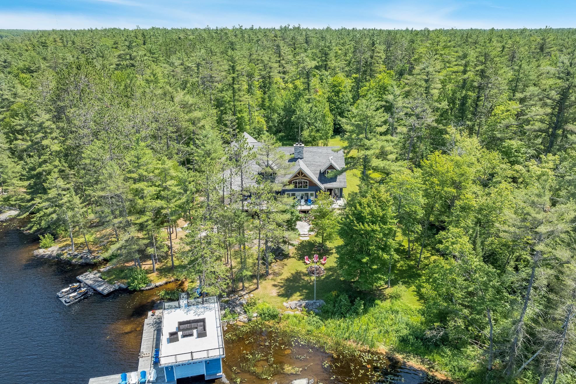 Experiencethe epitome of lakeside living in thisbreathtaking 5,348 square foot waterfront estate,gracefullyset on nearlytwo acresof pristineprivacy.With 317'of clean,gentlysloping shoreline,you?llenjoyeffortlessaccessforswimming,boating,and purerelaxation.A detached boathousewith an inviting second-leveldeckoffersfront-rowseatsto awe-inspiring sunsets,whiletranquilcrown land to the east ensuresuninterrupted seclusion.Impeccablylandscaped groundsframethisretreat,highlighted bya striking 50'naturalstone fireplace and a cedar-lined,wood-fired sauna with a privatechanging area,perfect forunwinding aftera dayon the lake.Whetherit?s morning coffee on theglass-railed deckorquiet eveningsbeneath the stars,everymoment feelslike an escape.Inside,thoughtful design meetstimelessMuskoka charm.Crafted with custom hand-hewn Douglasfirtrim,doors,and staircases,made on-site,the home radiateswarmth and authenticity.Expansive tilt-and-slidewindowsand wall-to-wallreardoorsseamlesslyblend indoorand outdoorliving,flooding the open-concept layout with naturallight.Throughout,premium flooring and high-end cabinetryecho the home'scommitment to quality,whilea Sonosmulti-zone audio system fillseverycornerwith music.Foryear-round peace of mind,an advanced automated securitysystem keepswatch.Wakeeach dayto panoramic waterviewsfrom the serene primarysuite,where oversized windowsinvite theoutdoorsin.Acustom walk-in closet ensuresorganized elegance,and the spa-inspired five-pieceensuite offersa glasswalk-in rain shower,deep soaking tub,heated floors,and a privatewatercloset forultimatecomfort and privacy At the heart of the home,a grand living room crowned bya soaring 23?naturalstonefireplace createsa warm,dramatic focalpoint.The chef?skitchen isboth functionaland beautiful,with top-of-the-line appliances,Caesarstonecentre island,premium cabinetry,and a spaciouspantryforstorage.Adjacent,the Muskoka room offersthe ultimateentertaining experience,completewith a naturalstone fireplace,built-in barbequewith granitecounters,and expansive sliding doorsand screensthat invite the outdoorsin,rain orshine. Beyond themain living spaces,discovertheimpressive 2,000 square foot oversized three-cargarage,designed asan integrated extension of the home.Above,a privateguest suite offersa spaciousbedroom and a cozyliving room with a cornerfireplace,idealfor extended familyorovernight guests.Inside the main home,fouradditionalbedroomson the upperlevelensure everyonehastheirown space.Thisestate capturesthe truespirit of Muskoka living,offering both an elegant familyhome and a timelessretreat.