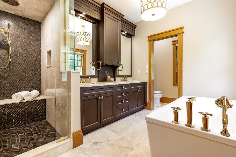 - Quartz-topped dualsinkvanityadorned by rich-toned cabinetry